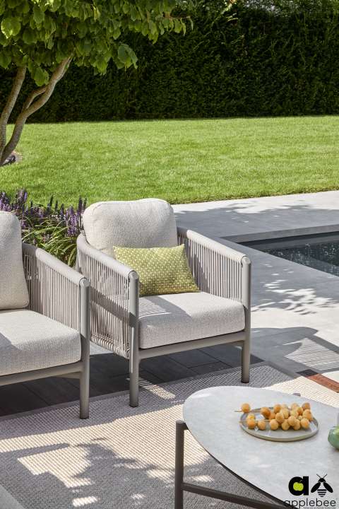 Rope-weefsel: Het frame is omvlochten met hoogwaardig All Weather Rope. Dit gevlochten touw geeft de set een moderne, open uitstraling en is bestand tegen zon en regen.