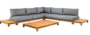 De set bestaat uit: 2x 2-zitsbank, 1x corner en 1x coffeetable 107x107cm en 2x een teakhouten zijpaneel van 50cm