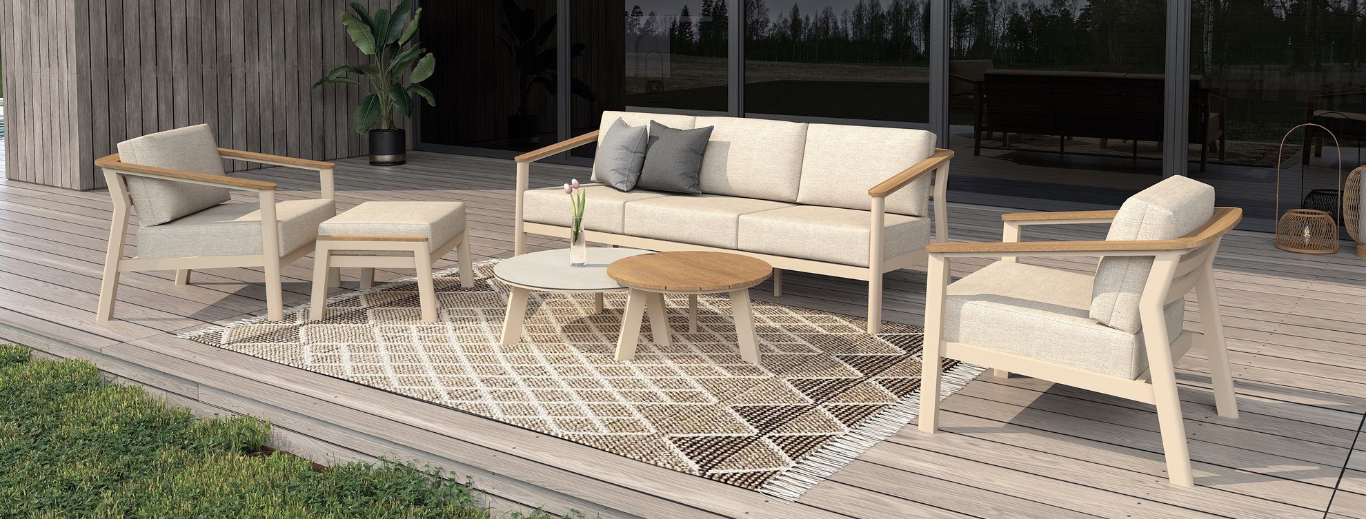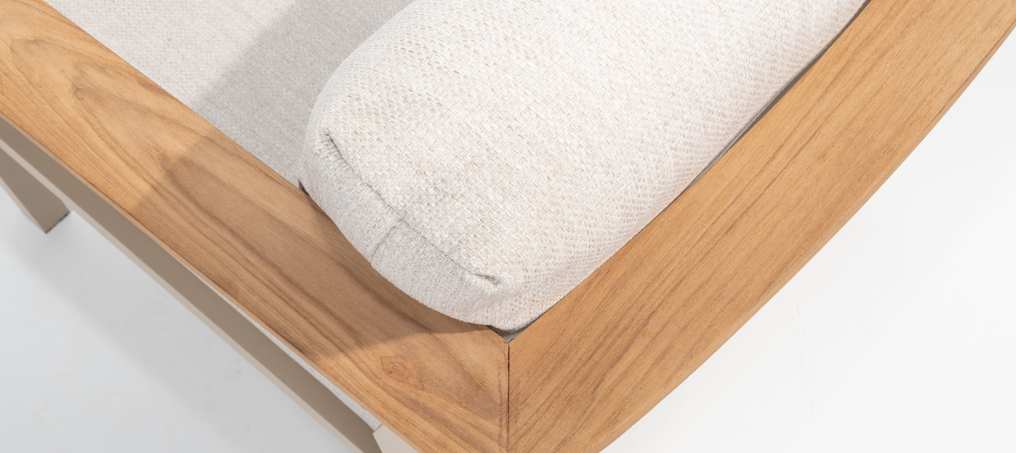Deze set is uitgevoerd in de moderne kleur latte en heeft teakhouten armleuningen dat nu hem nu net de finishing touch geeft.