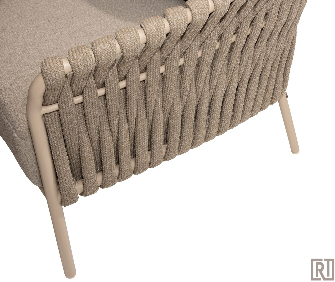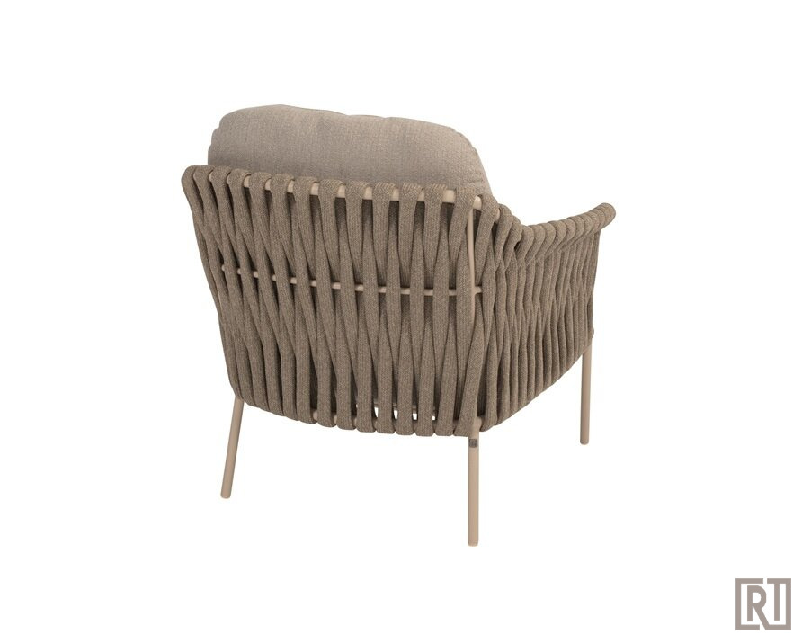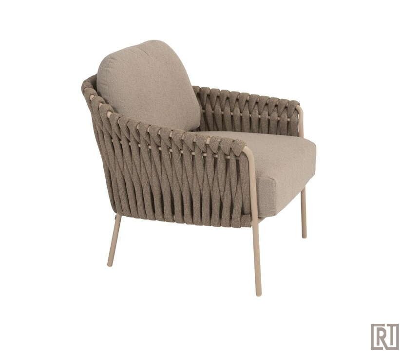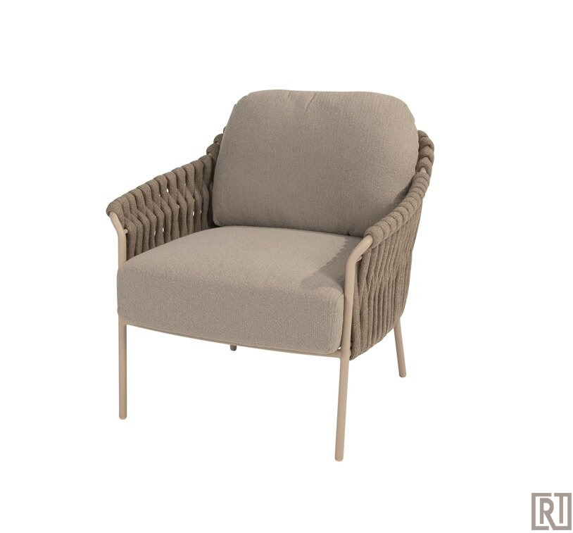 De low dining armchair wordt geleverd met een all weather kussenset in de fraaie boucle clay stof ( taupe)