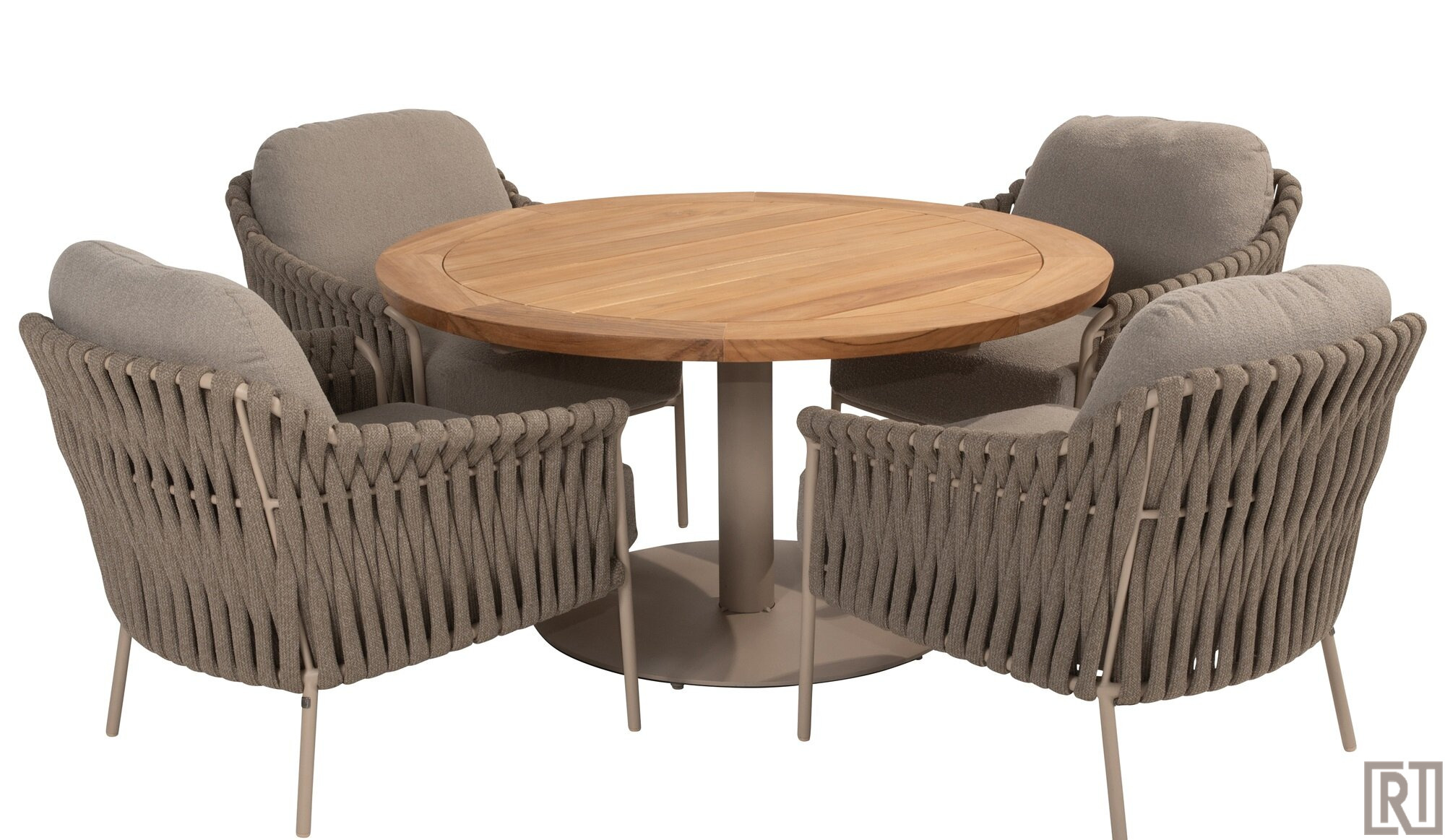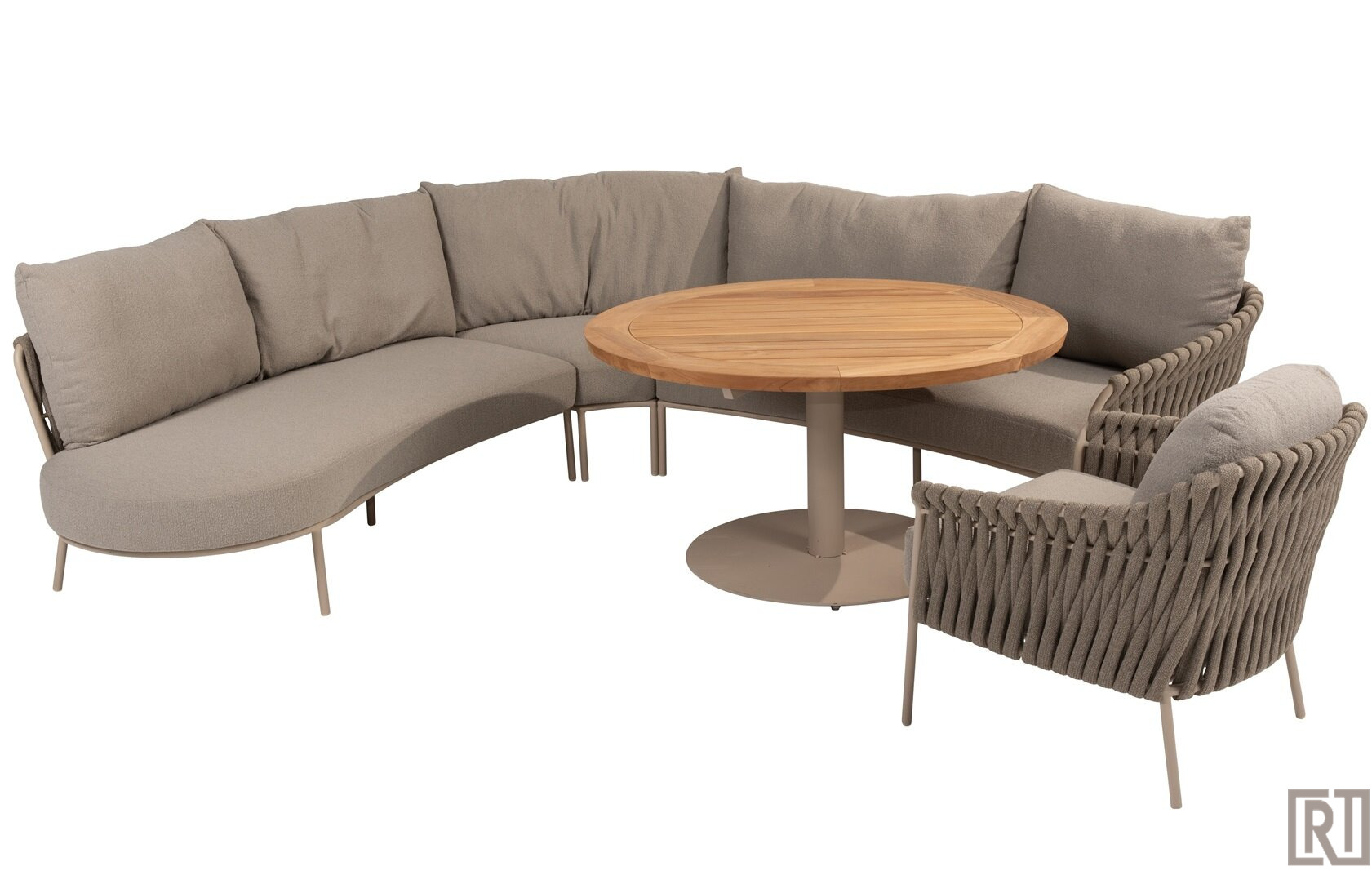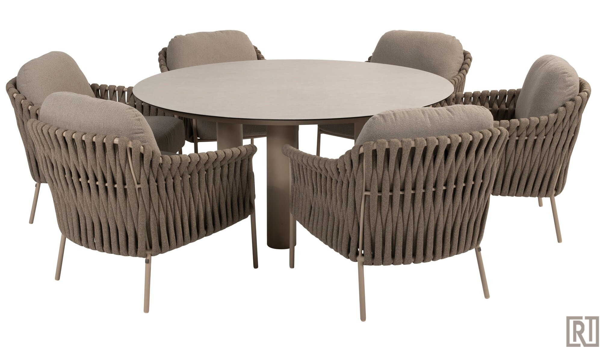 De low dining armchair wordt geleverd met een all weather kussenset in de fraaie boucle clay stof ( taupe)