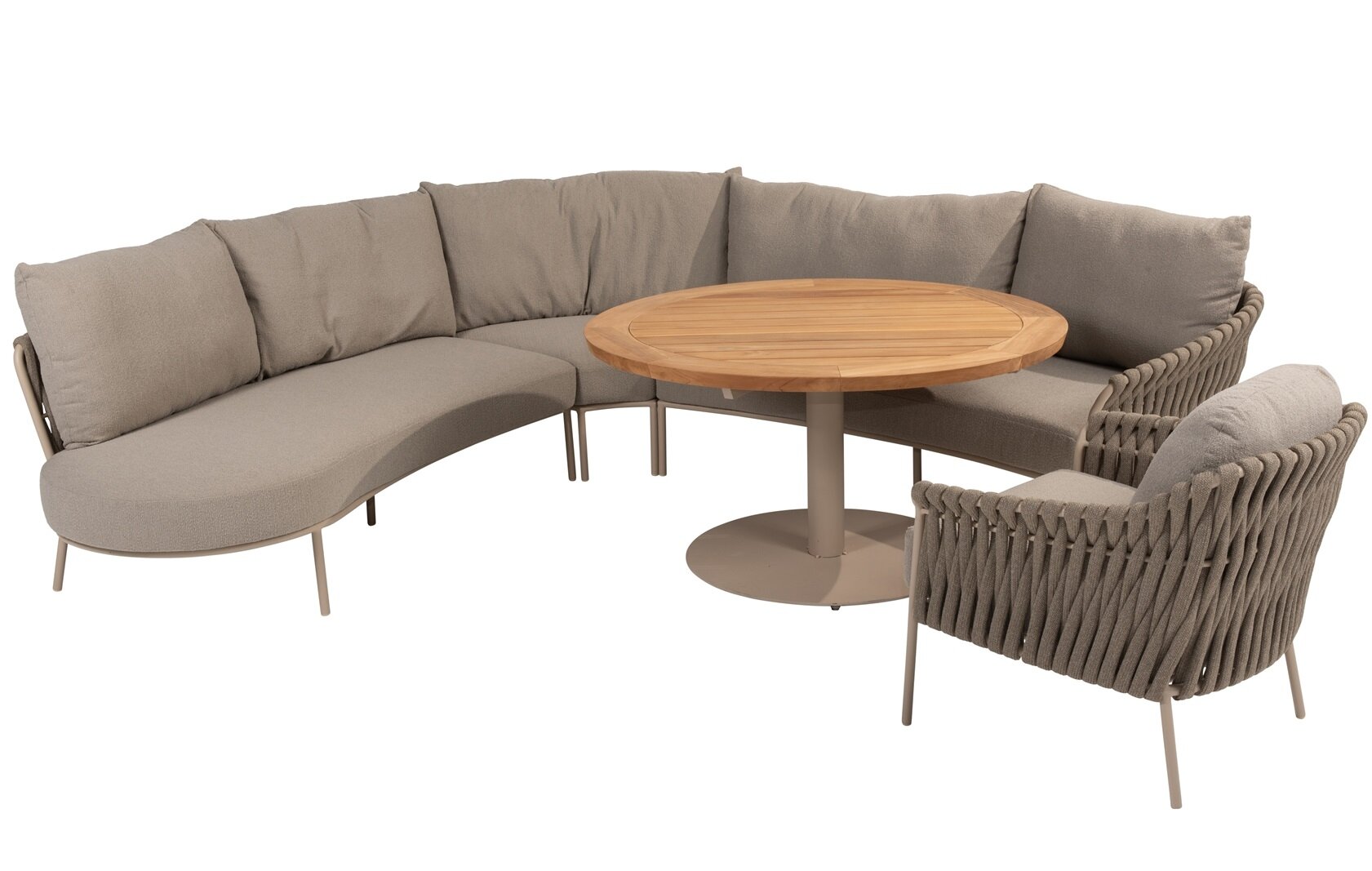 de Comino loungeset wordt geleverd met een all weather kussenset in de fraaie boucle clay stof ( taupe)
