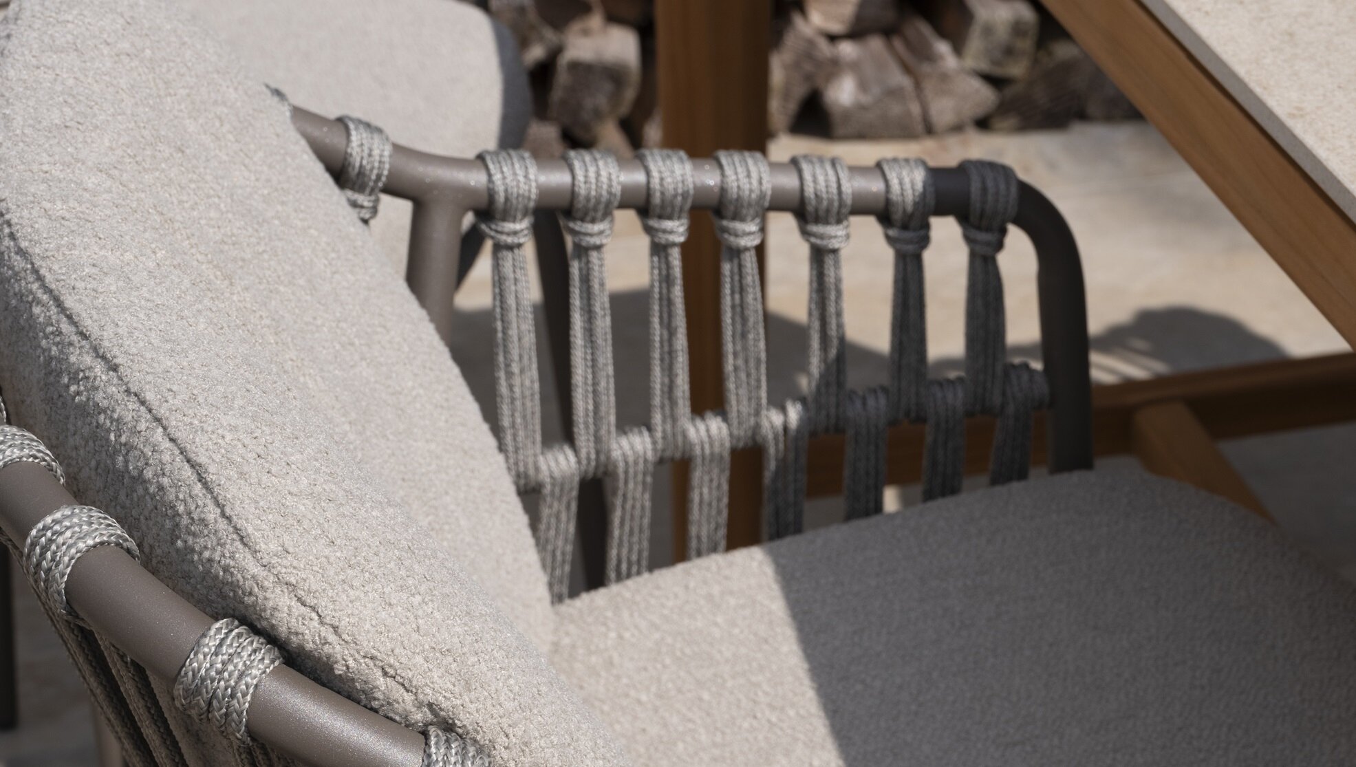 De Capalbio counter chair wordt geleverd met een all weather kussenset in een sterke aaibare boucle stof clay ( taupe kleurig )