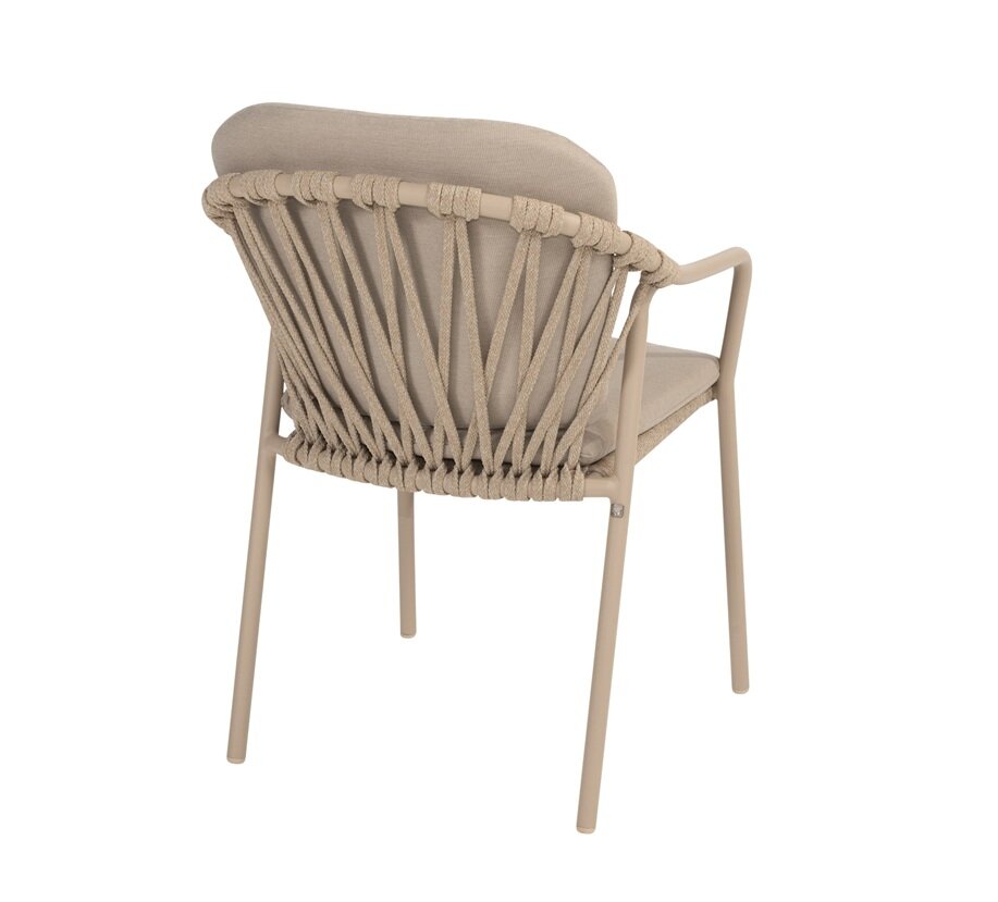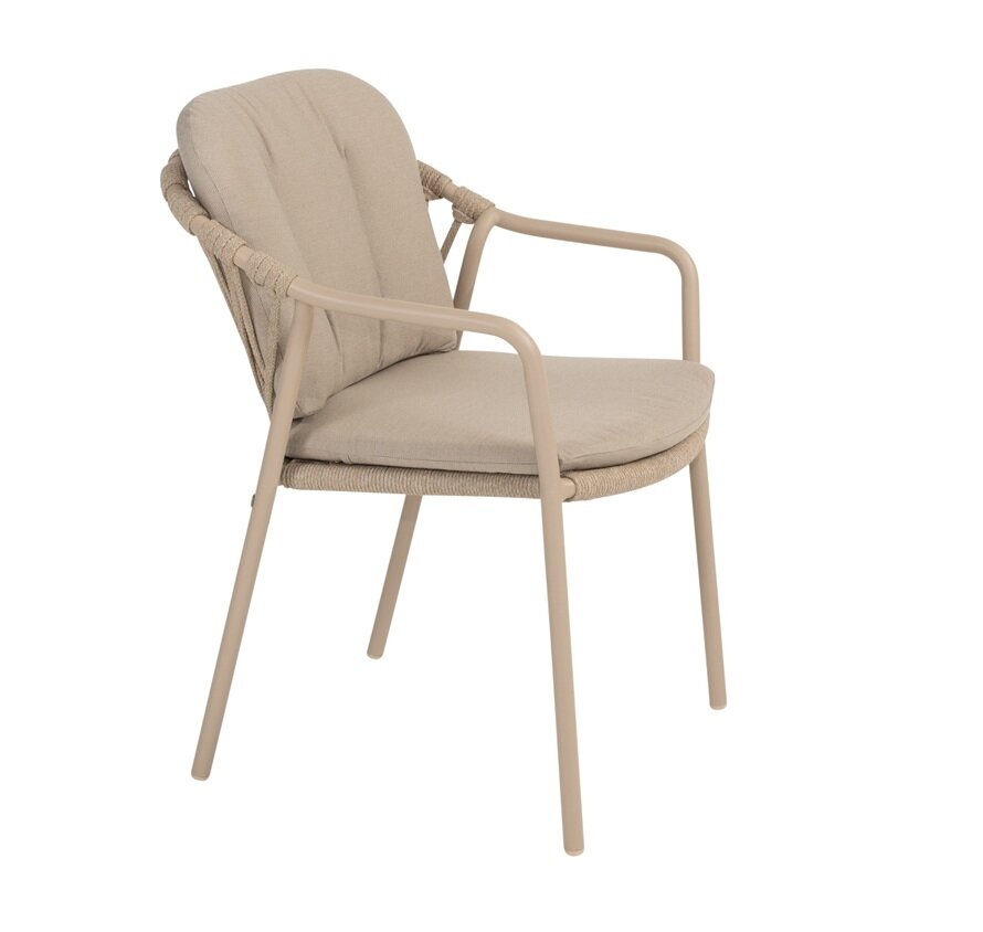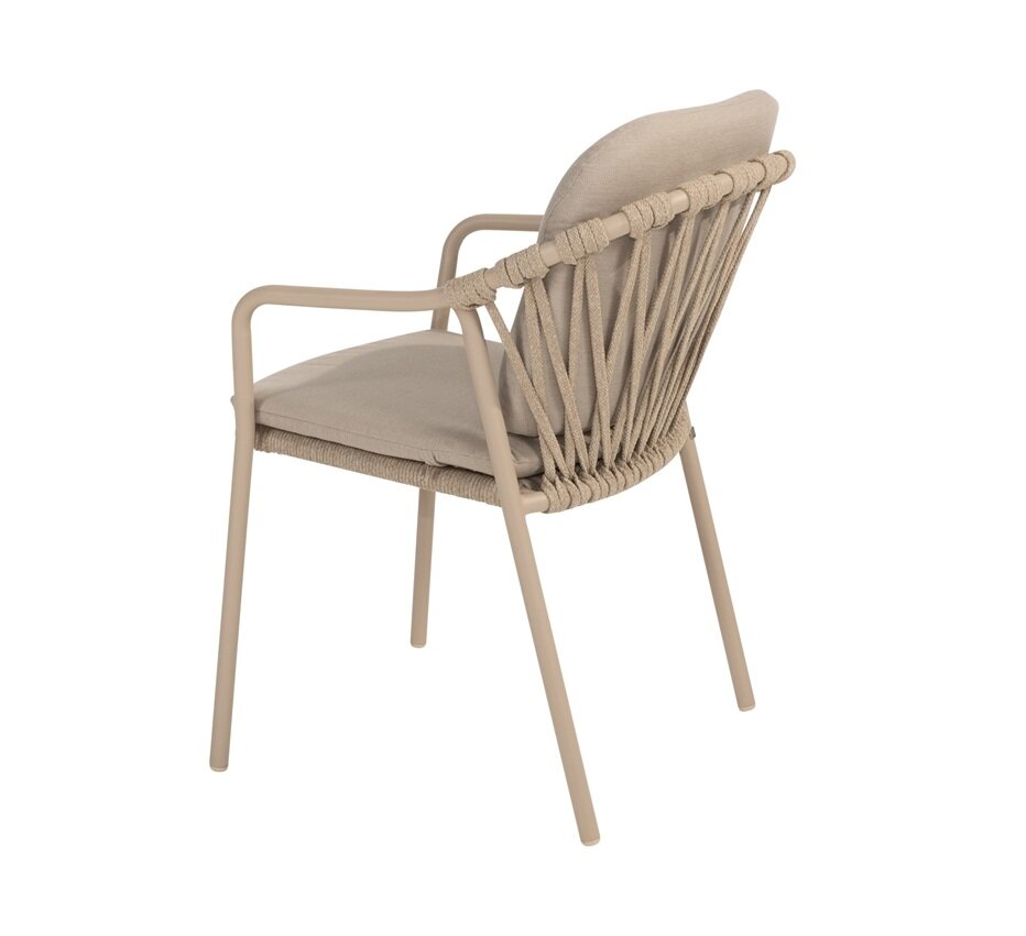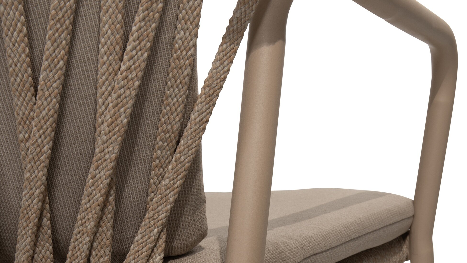 De Manitoba armstoel is gemaakt van een gepoedercoat aluminium frame met een ren afgewerkt met fraai rope een taupe kleur en een frame in naturel kleur latte.