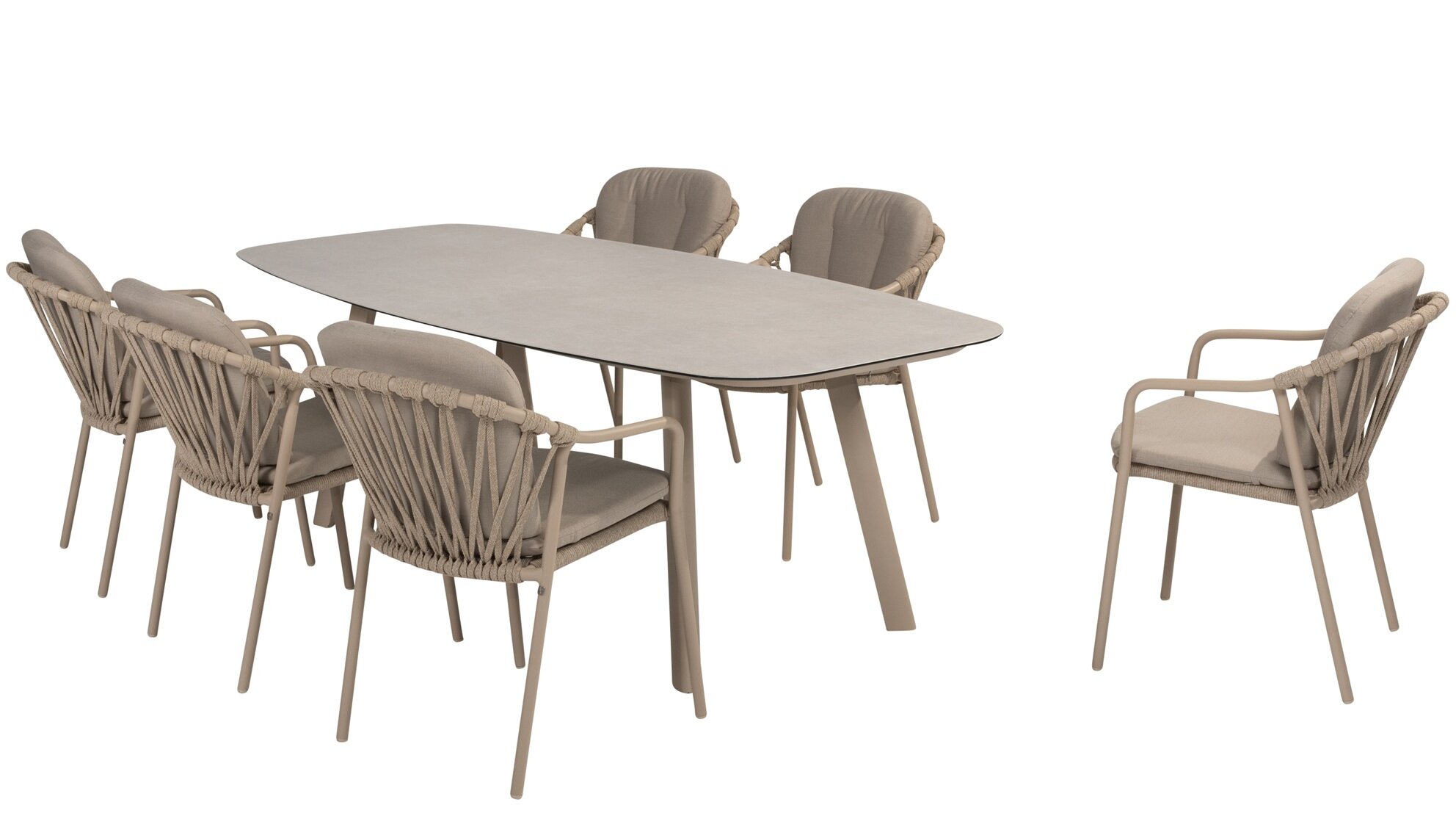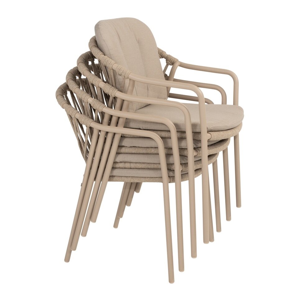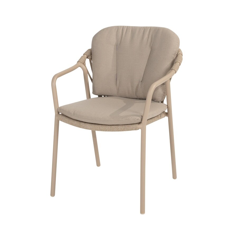 De Manitoba armstoel is gemaakt van een gepoedercoat aluminium frame met een ren afgewerkt met fraai rope een taupe kleur en een frame in naturel kleur latte.
