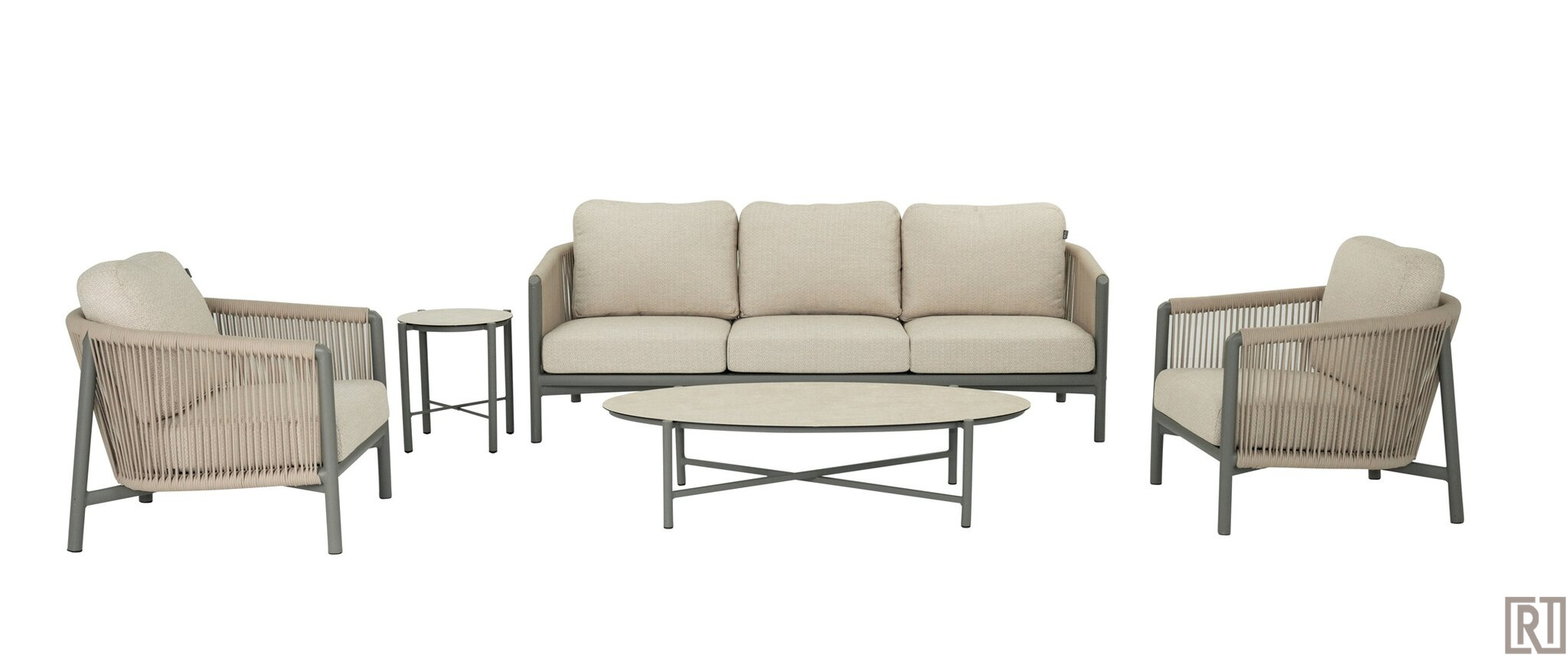 Rope-weefsel: Het frame is omvlochten met hoogwaardig All Weather Rope. Dit gevlochten touw geeft de set een moderne, open uitstraling en is bestand tegen zon en regen.