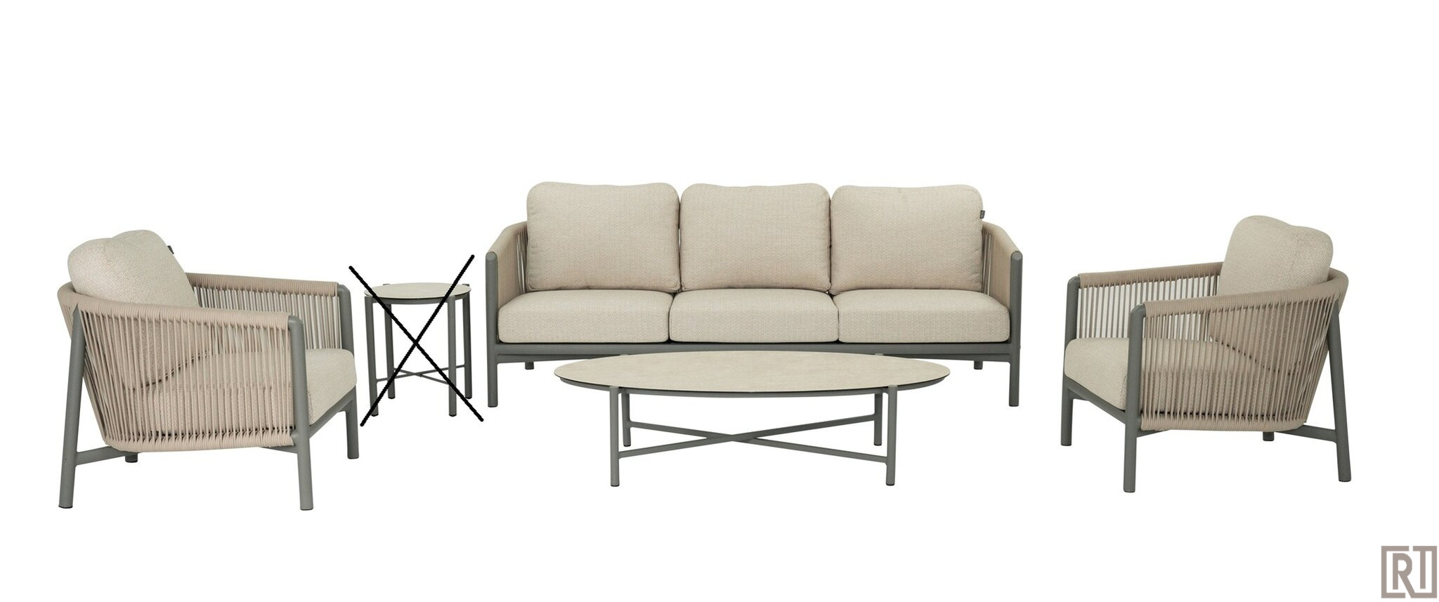 Rope-weefsel: Het frame is omvlochten met hoogwaardig All Weather Rope. Dit gevlochten touw geeft de set een moderne, open uitstraling en is bestand tegen zon en regen.