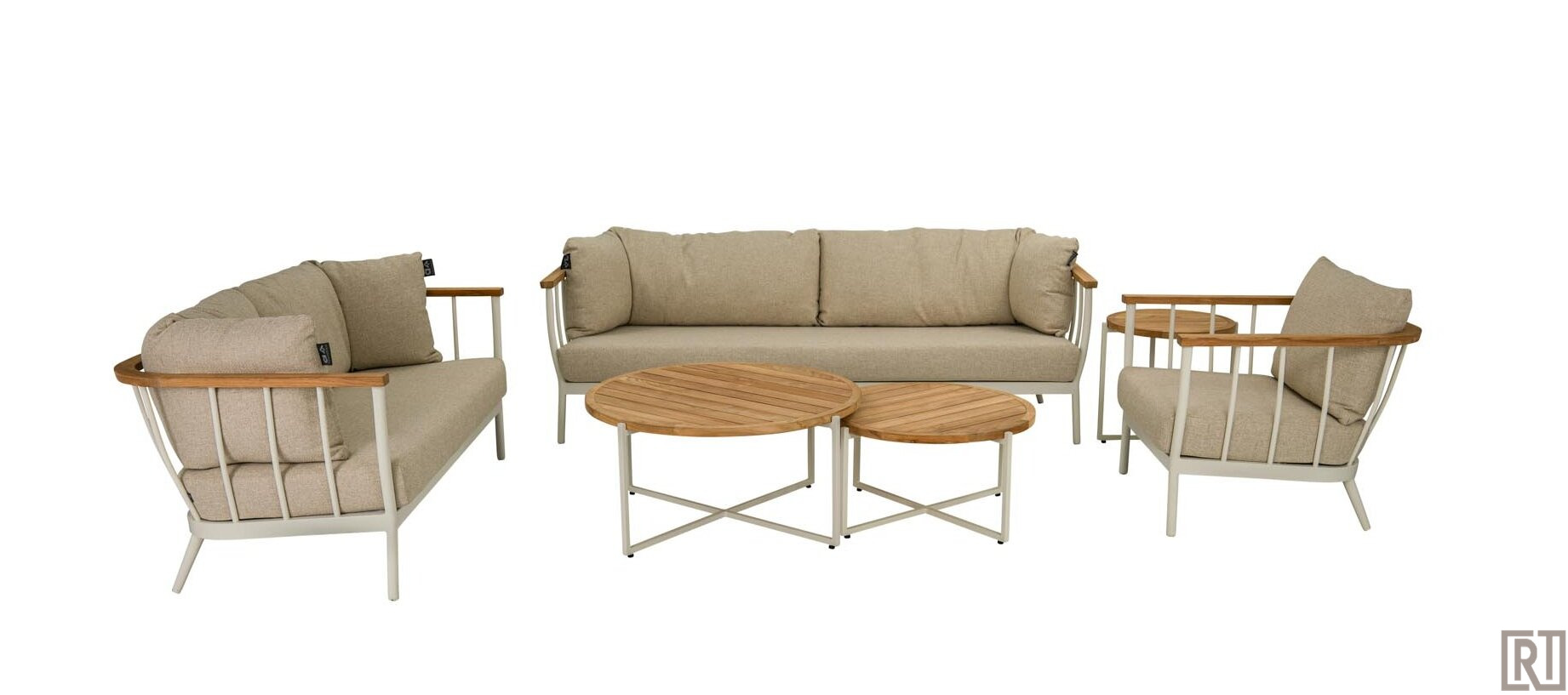 Deze fantastische loungeset bestaat uit: 1x 3-zitsbank ( 217cm ), 1x 2-zitsbank (150cm ), 1x loungechair, 1x salontafel 94cm rond en 1x salontafel 74cm rond.