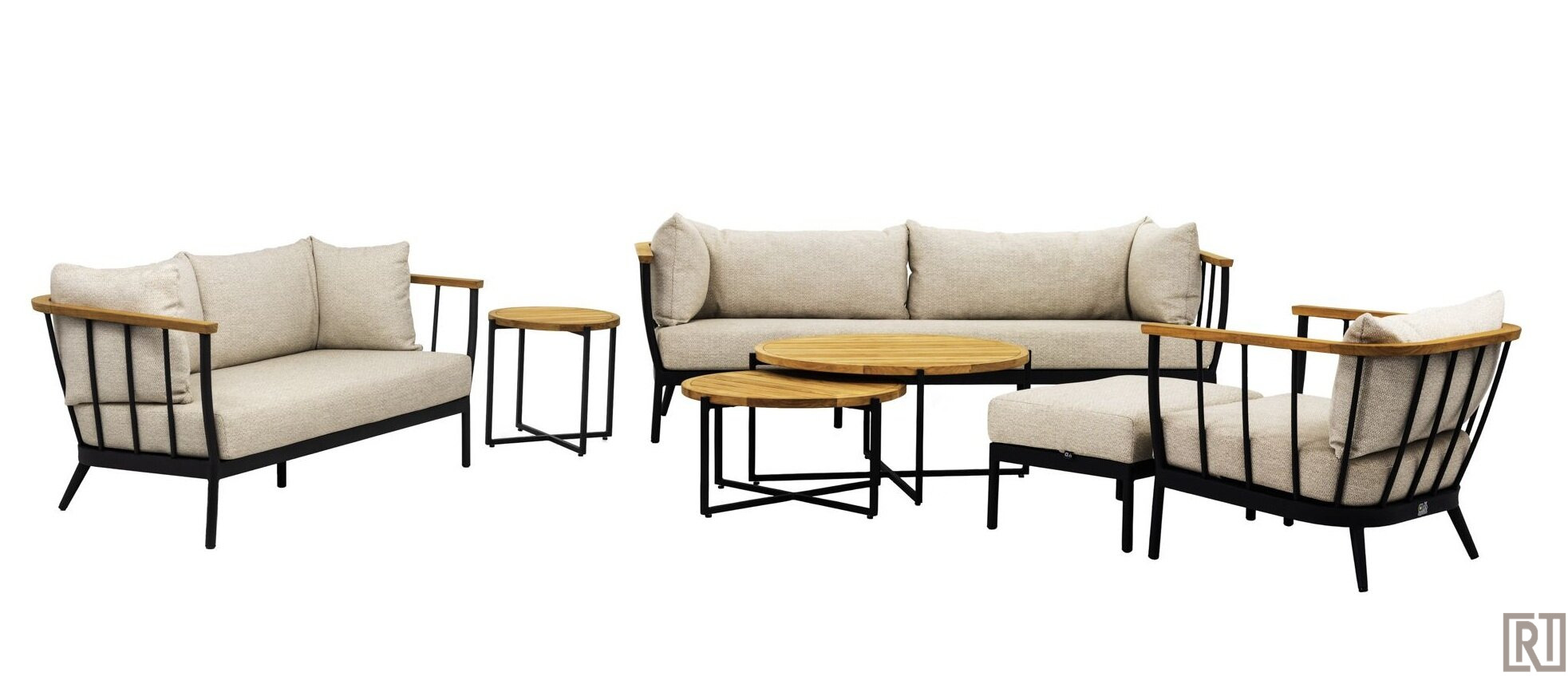 Deze fantastische loungeset bestaat uit: 1x 2-zitsbank (150cm ), 1x 3-zitsbank ( 217cm ) 1x loungechair, 1x ottoman, 1x salontafel 94cm rond en 1x salontafel 74cm rond.