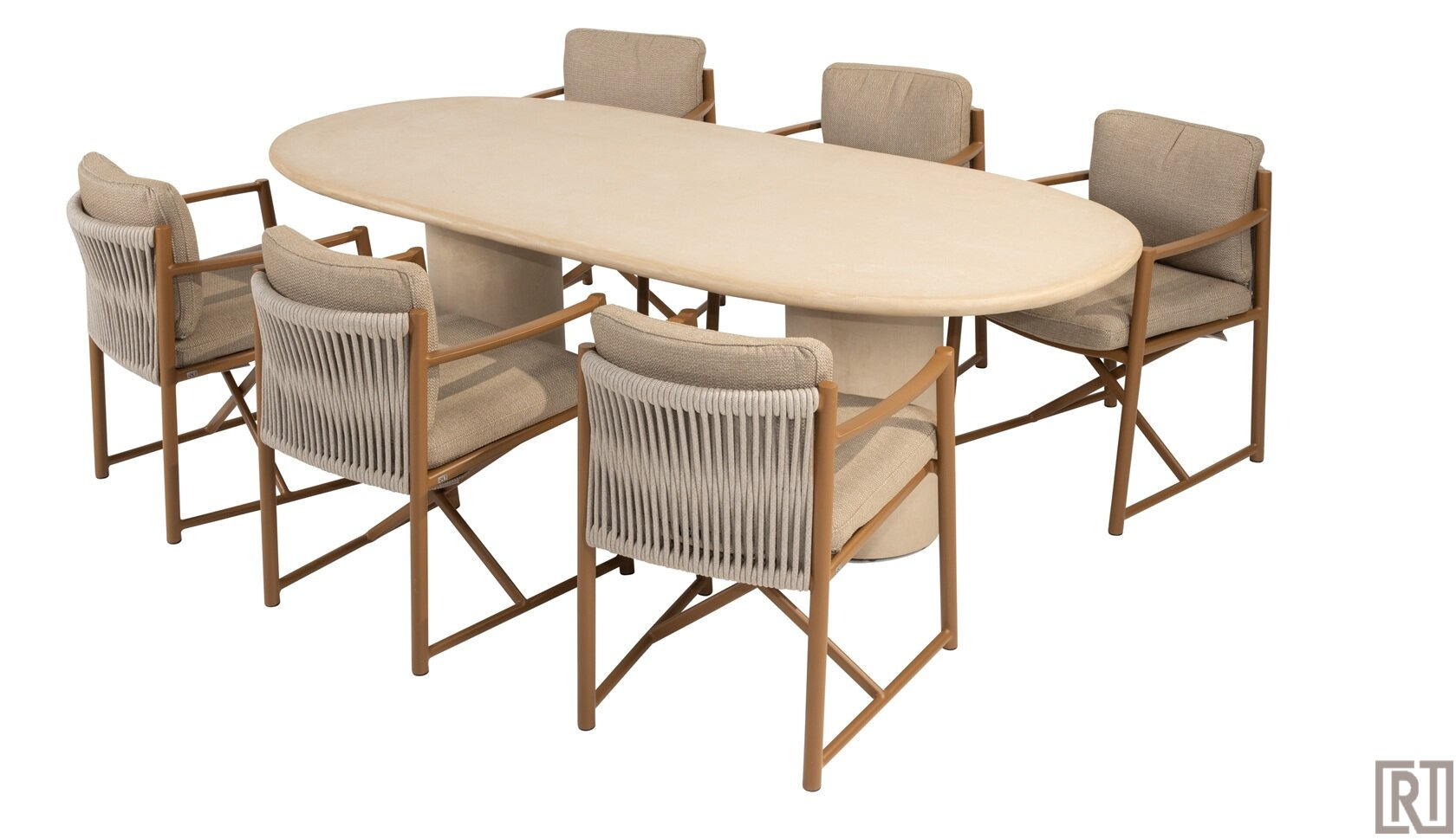 De Marina 7-delige dining set bestaat uit: 1x Hampton ovale tafel van 240x105cm met Mortex top ( stoere betonlook ) en 6x de Marina dining chair incl kussensets.