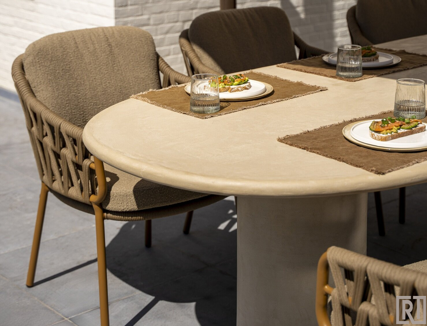 De Hampton oval dining table is gemaakt van Mortex een nieuw materiaal dat zeer sterk is en winterhard. Tevens zeer gemakkelijk in onderhoud.