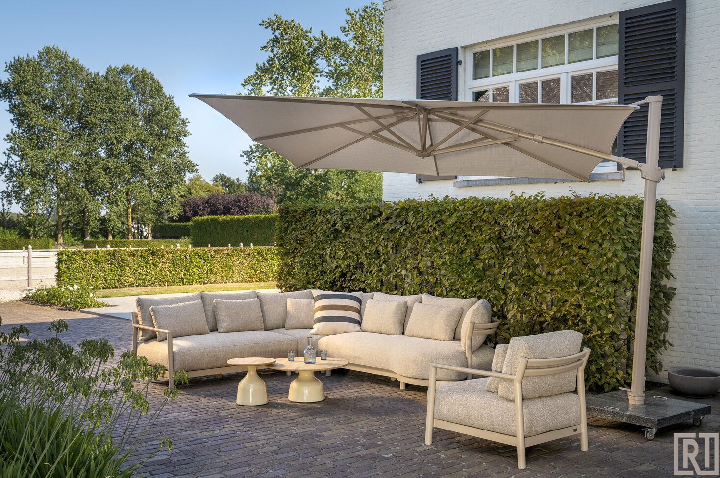 In de sfeervolle kleur latte in combinatie met een fraaie all weather kussenset in de stof Hykaron luxury. Zo'n mooie stof die u in het echt moet komen zien!