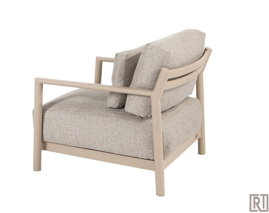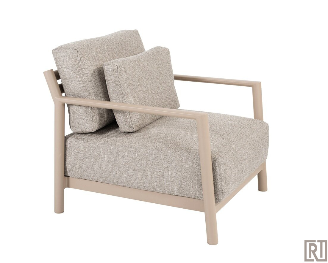 De Mykonos loungechair kenmerkt zich door de ronde aluminium kokers en de dikke all weather kussens.