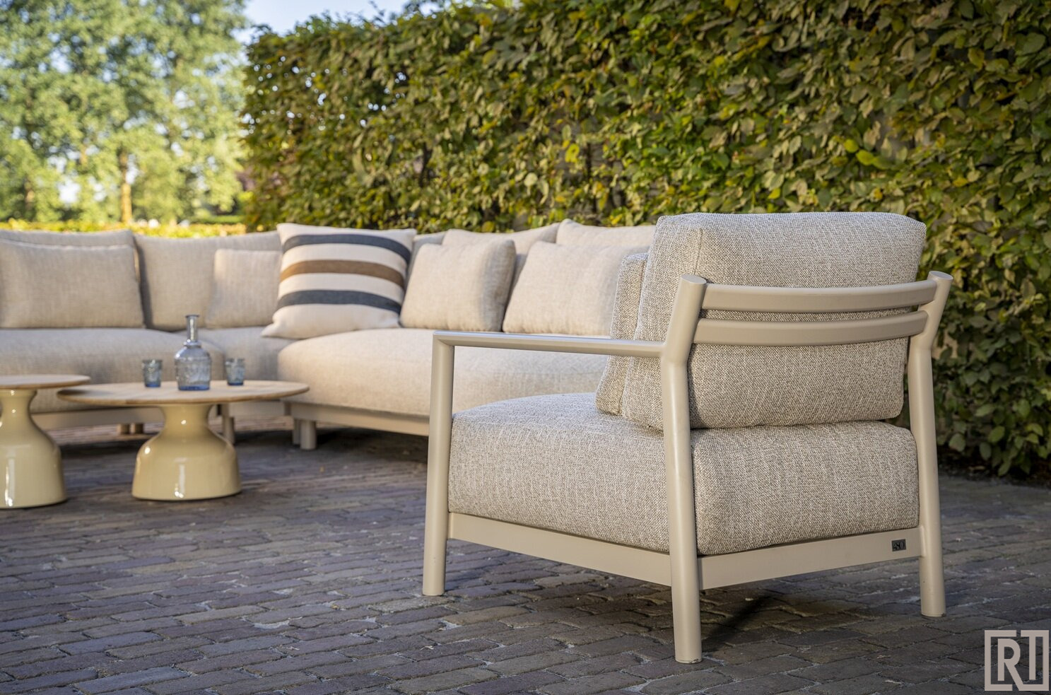 In de sfeervolle kleur latte in combinatie met een fraaie all weather kussenset in de stof Hykaron luxury. Zo'n mooie stof die u in het echt moet komen zien!