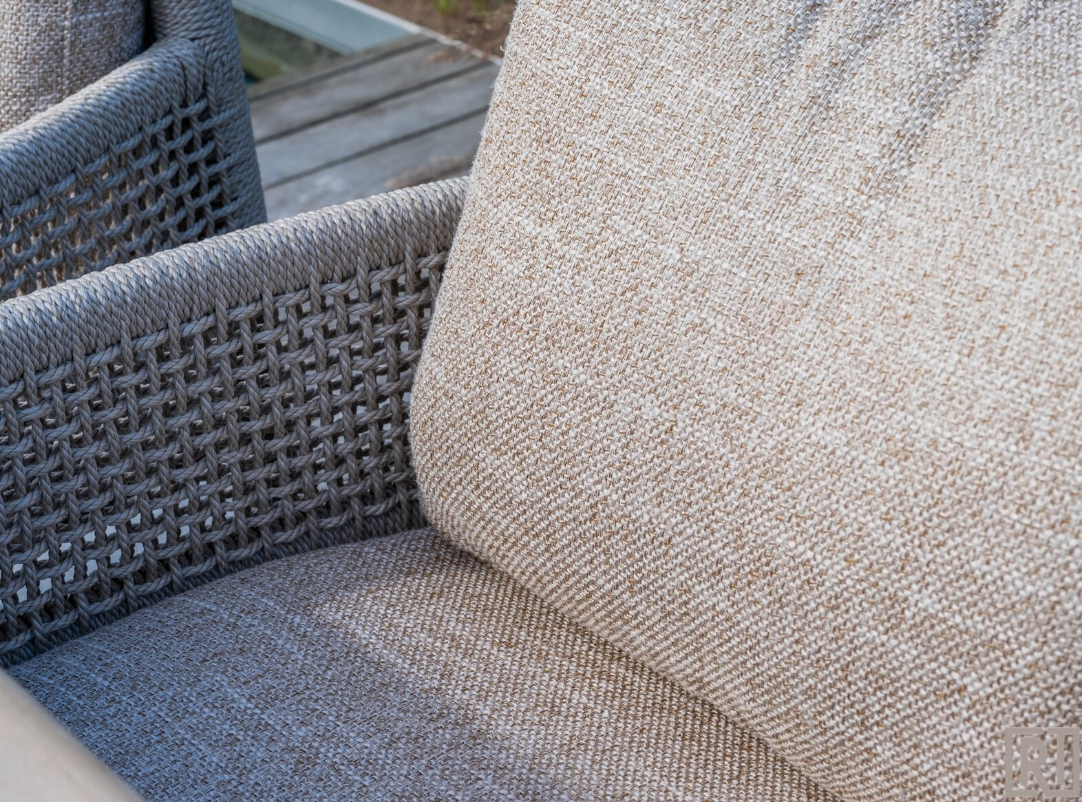 De Armstoel wordt geleverd met een all weather kussenset in een fraaie zand-taupe kleurige stof Hykaron luxury hetgeen een grof geweven stof is in olefin met een natuurlijke uitstraling.
