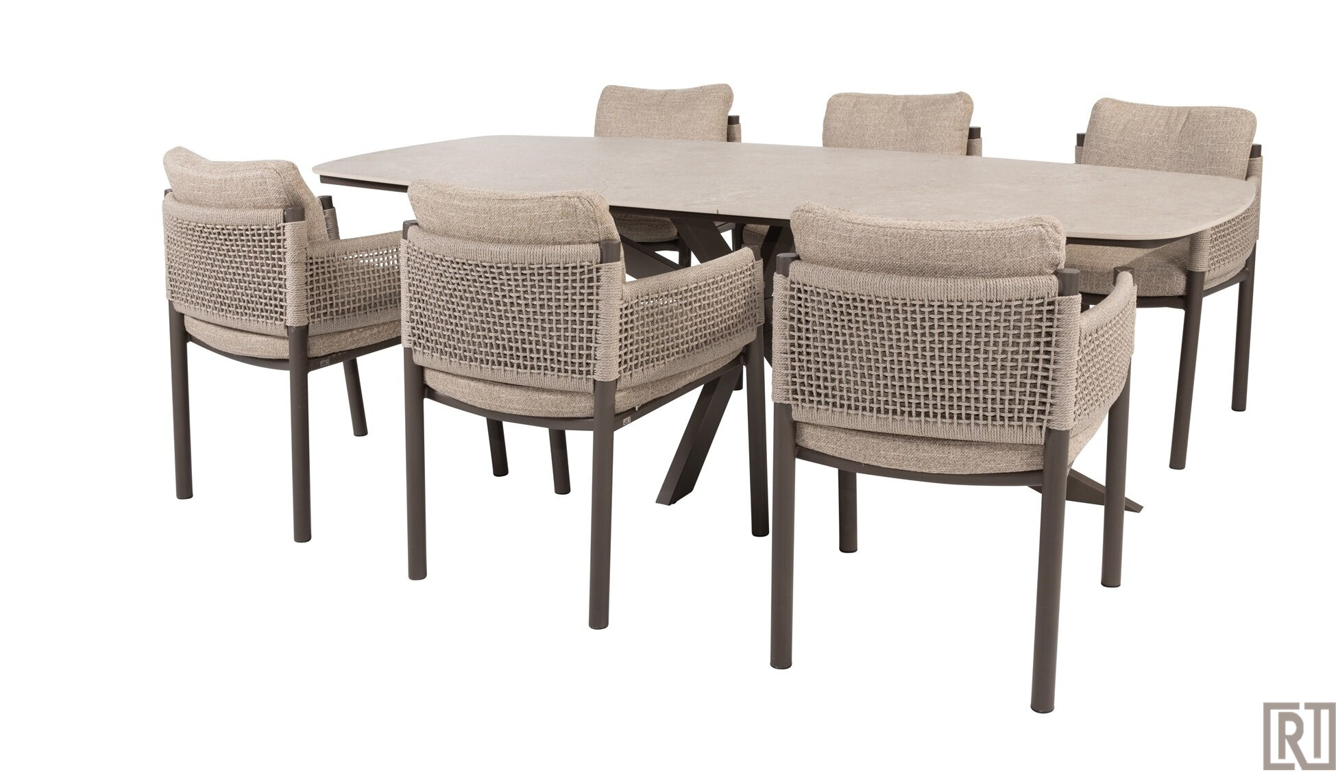 De Savanne dining set is bestaat uit: 1x Prado barrel shape 240x105cm tafel met keramiek blad en terre onderstel in combinatie met 6 stuks Savanne armstoel incl kussensets.