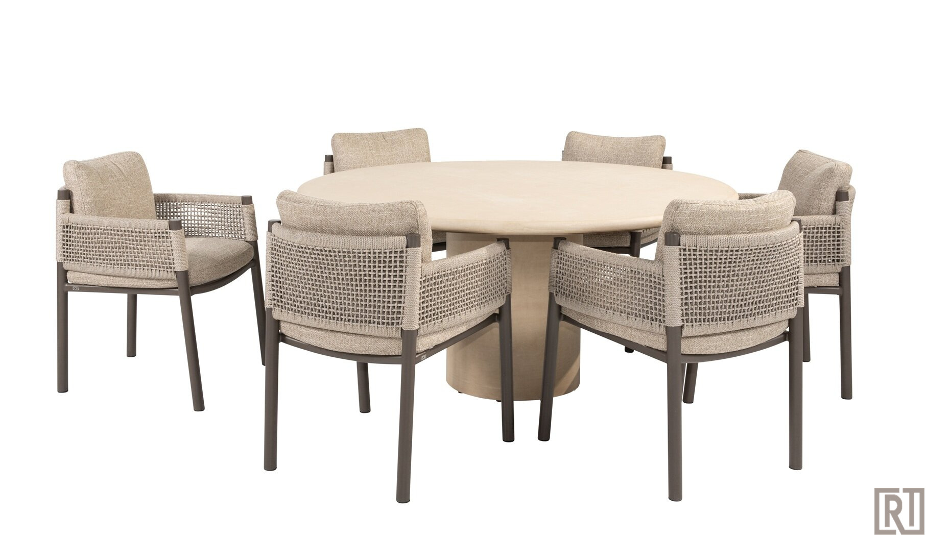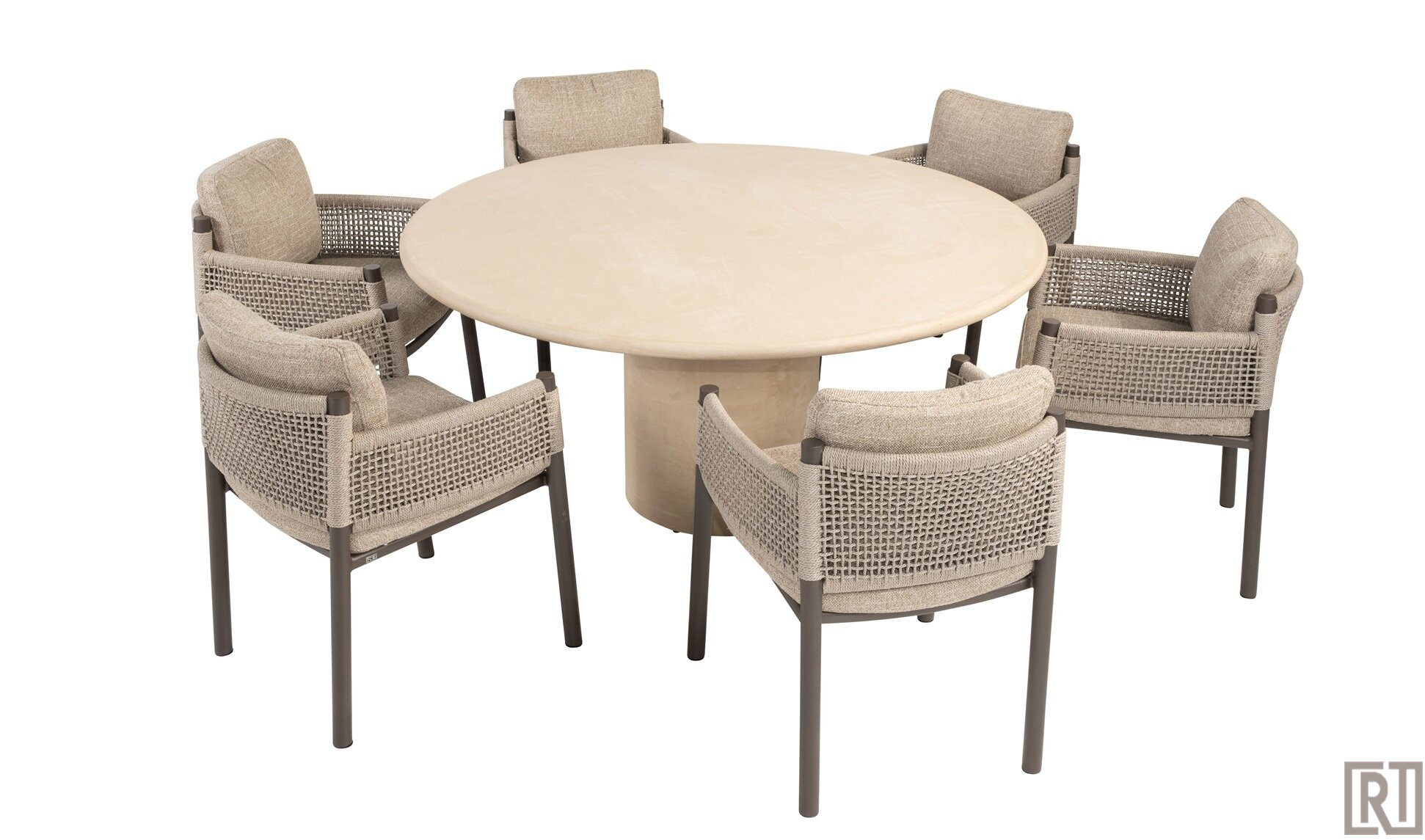 De Savanne dining set is bestaat uit: 1x Hampton round shape 160cm tafel Mortex ( betonlook ) in combinatie met 6 stuks Savanne armstoel incl kussensets.