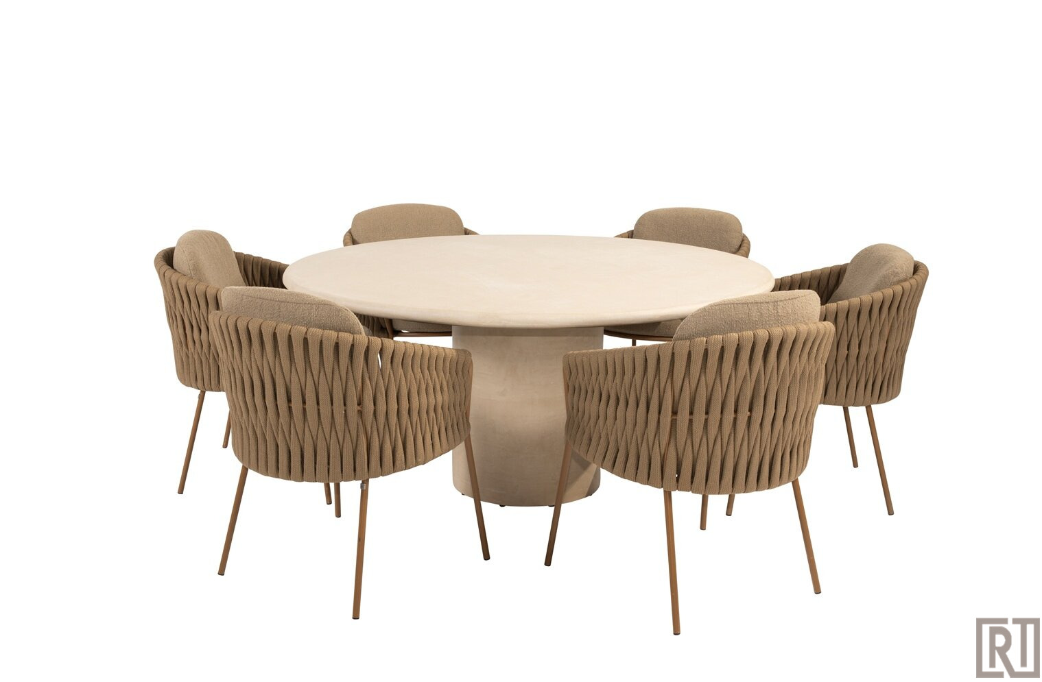 Deze dining set bestaat uit: 1x Hampton ronde tafel in 160cm van Mortex ( betonlook beige ), 6x armstoel Molina incl kussensets