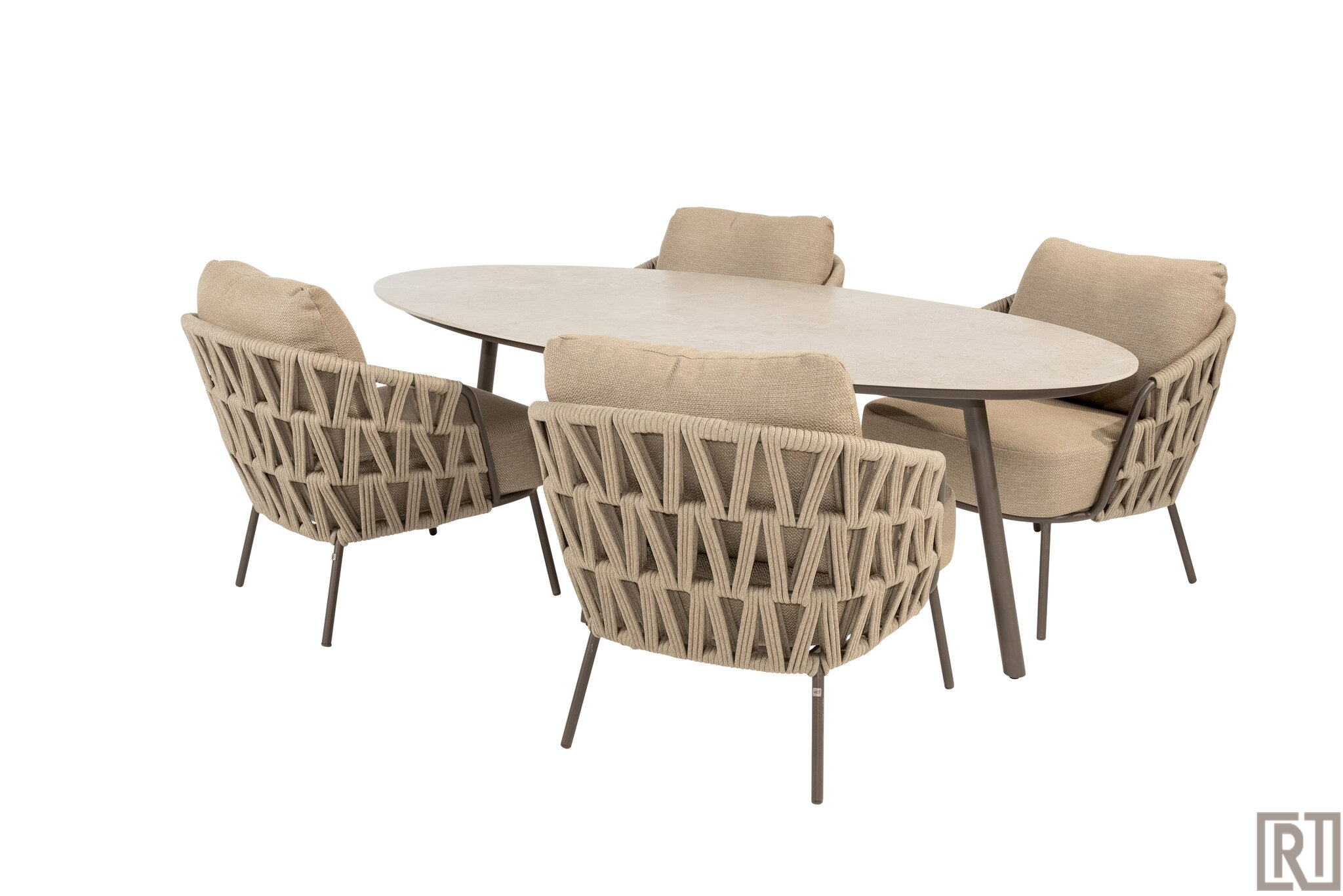 De Mallorca set bestaat uit: 4x low dining chairs en 1x de Salut ovale tafel van 220x100cm met keramiek blad.