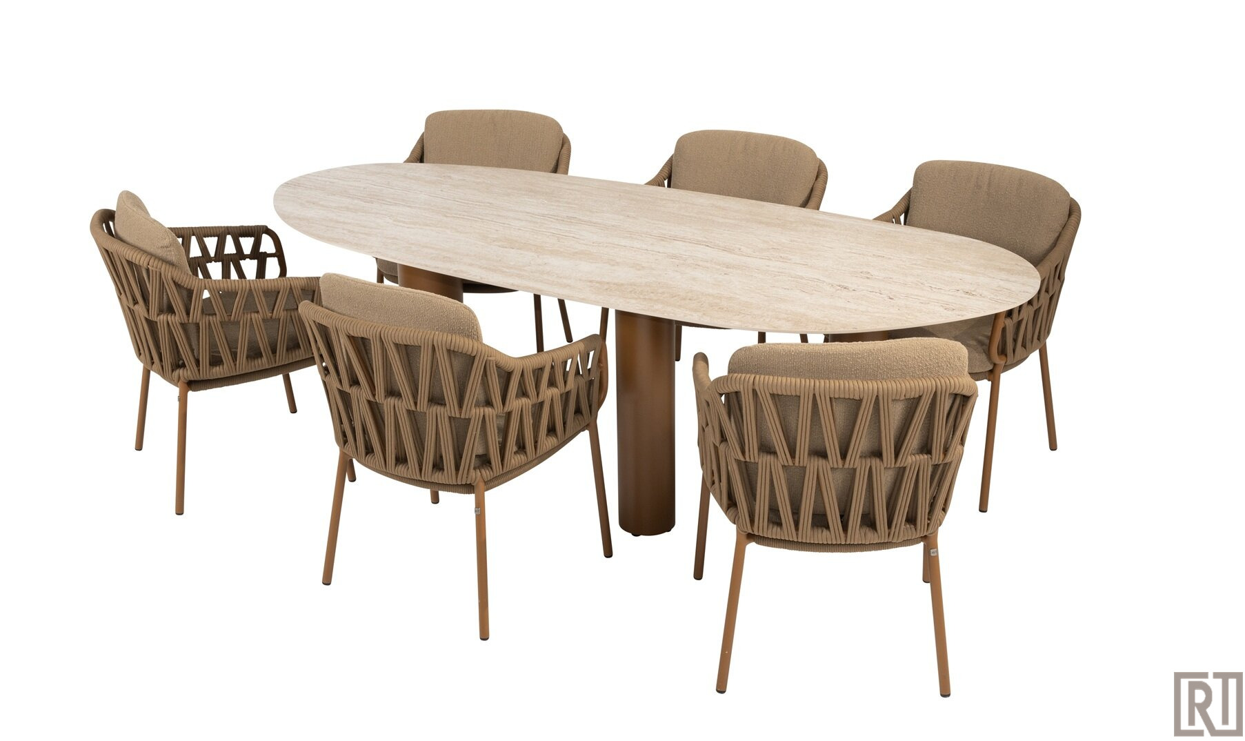De tafel Colorado ovaal is 240x105cm en heeft 2 ronde zuilen gemaakt van aluminium in de amberkleur poedercoating, het blad is van keramiek in de travertin look.