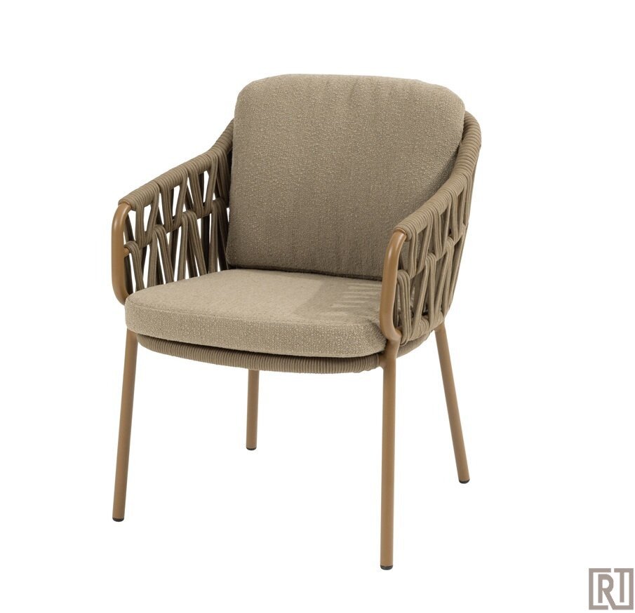 De Biarritz dining chair heeft een comfortabel zit- en rugkussen in de olefin all weather stof boucle amber