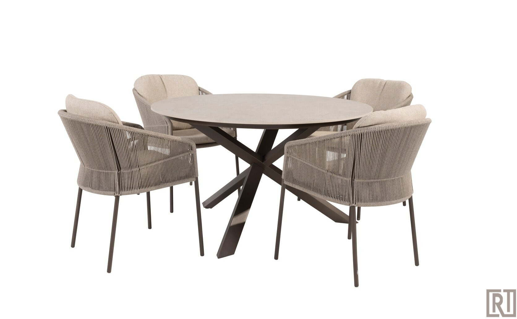 De set bestaat uit: 4x Florence dining chair en 1x de Prado ronde tafel 130cm met keramiek blad