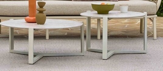 Deze Pine key coffee table set bestaat uit: 1x ronde tafel 79cm ( 33cm hoog ) en 1x ronde tafel 63cm ( 42cm hoog ) De tops van de bladen zijn van gesintered stone in de kleur cream