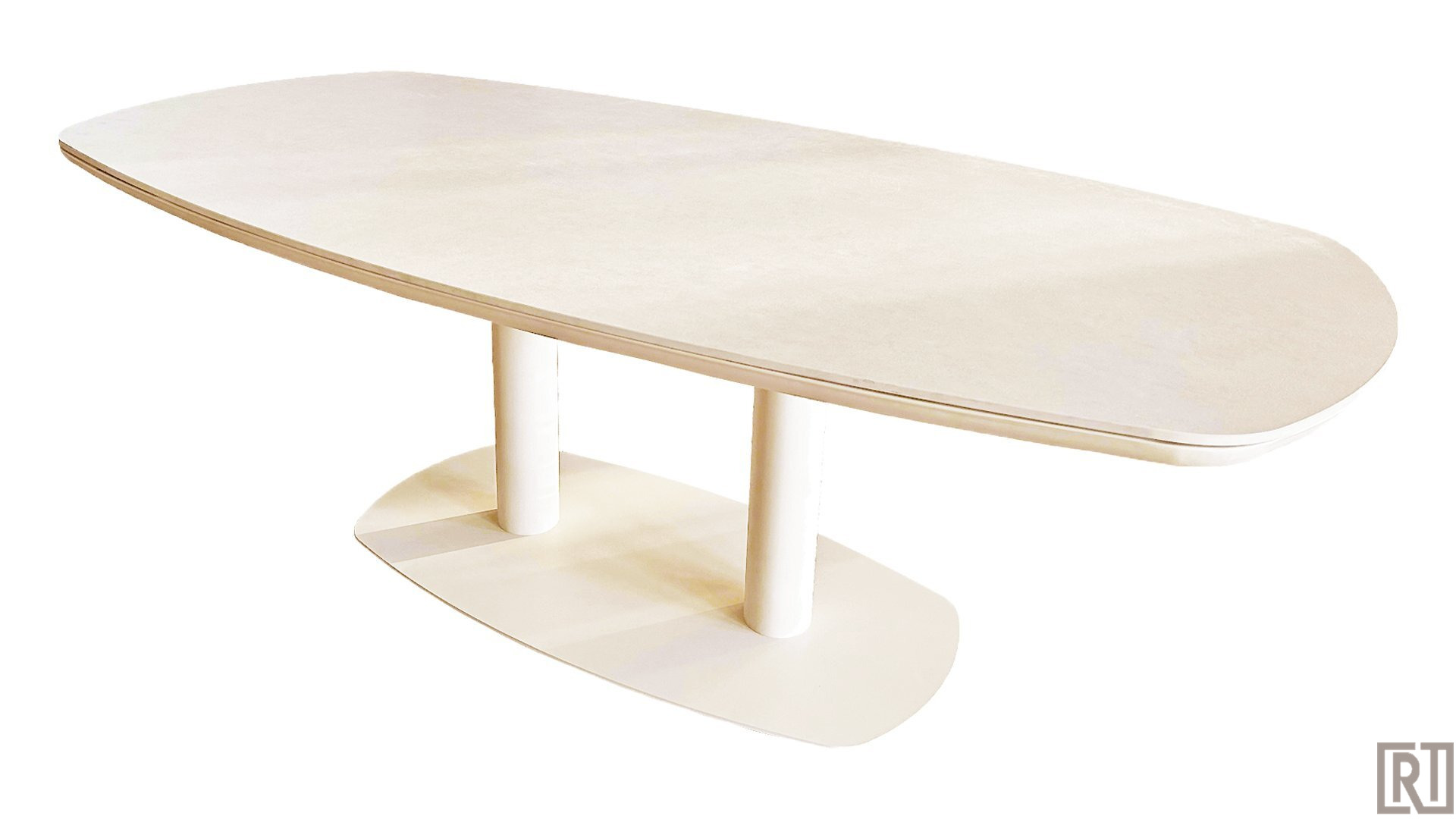 Het onderstel bestaat uit 2 ronde zuilen die tezamen komen op een false oval massieve plaat. Dit geeft de vrijheid om de stoelen willekeurig om de tafel te kunnen plaatsen.