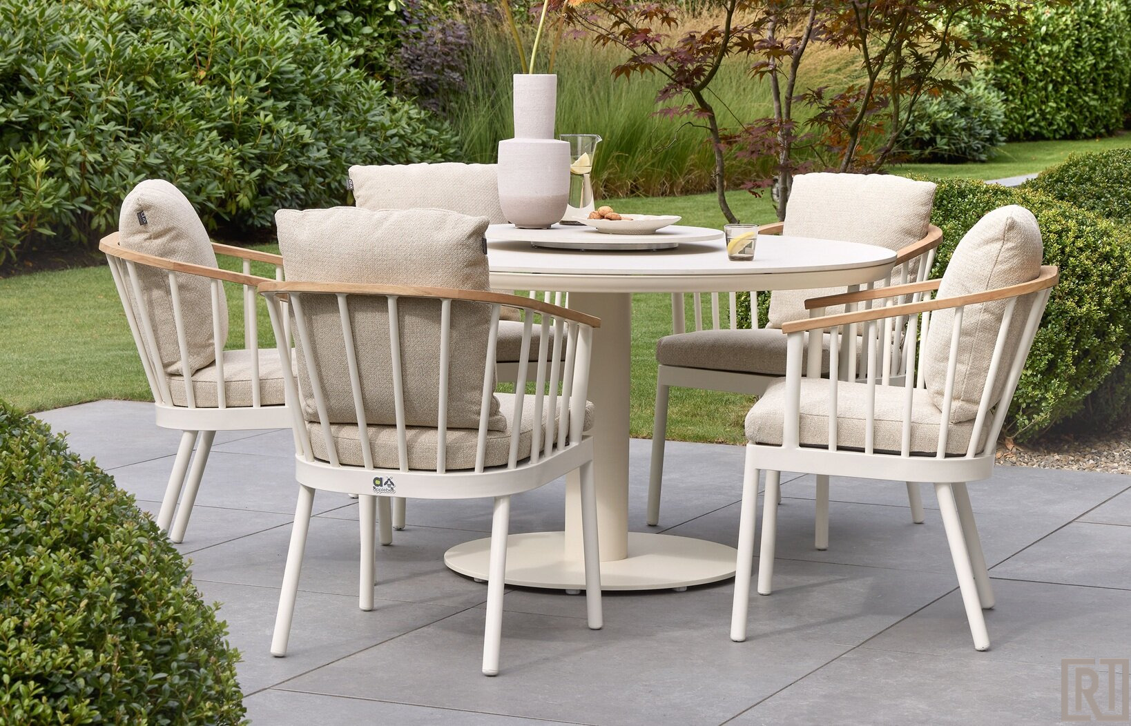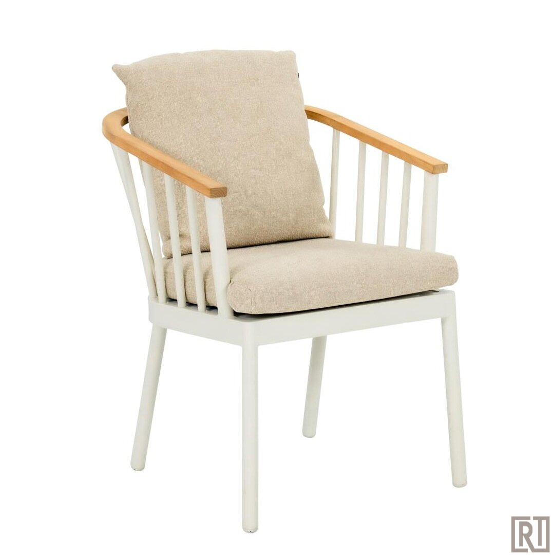 De set bestaat uit: 4x armstoel Condor in de kleur oyster en 1x de Melville tafel 140cm oyster