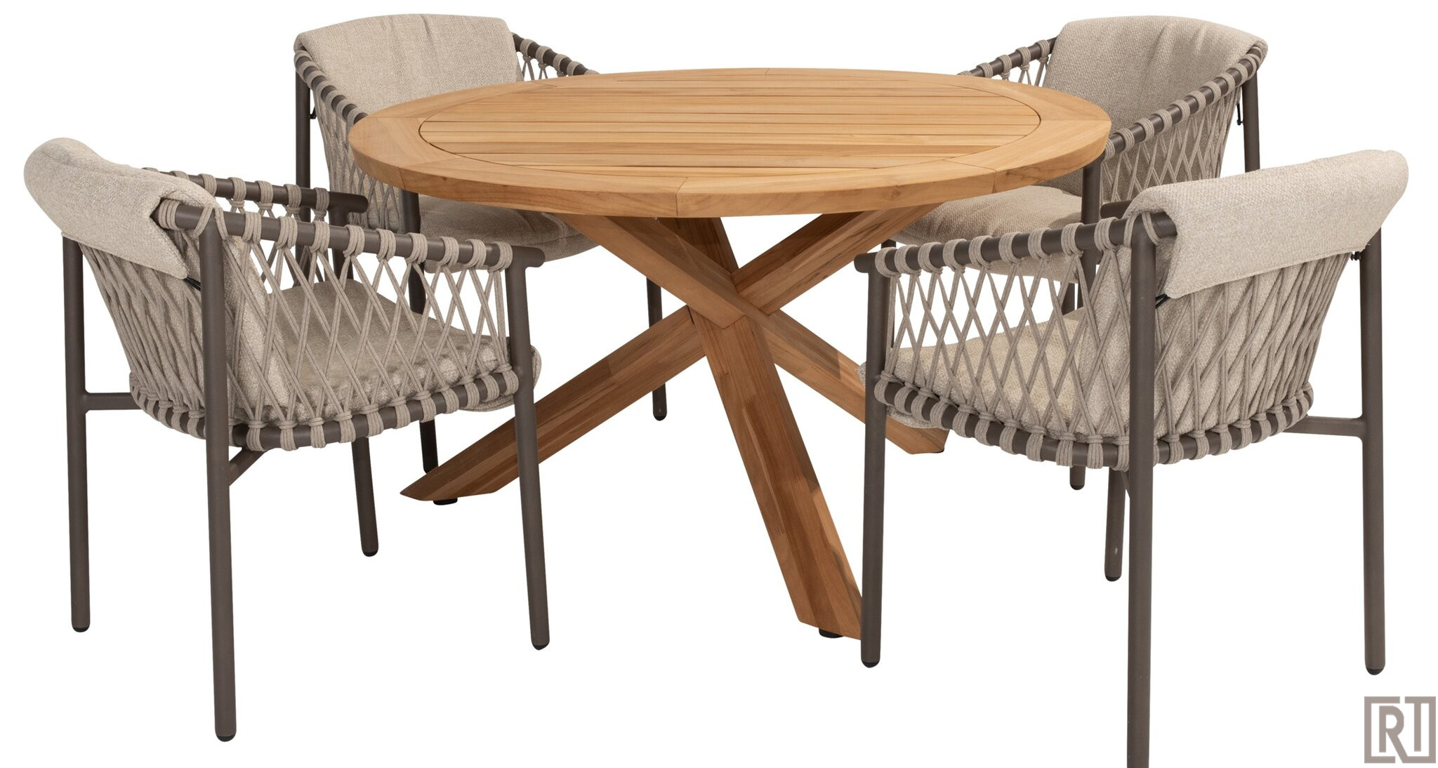 De Allora 5-delige dining set van 4 seasons outdoor is een vriendelijke dining set in de nieuwe kleur terre in combinatie met rope.