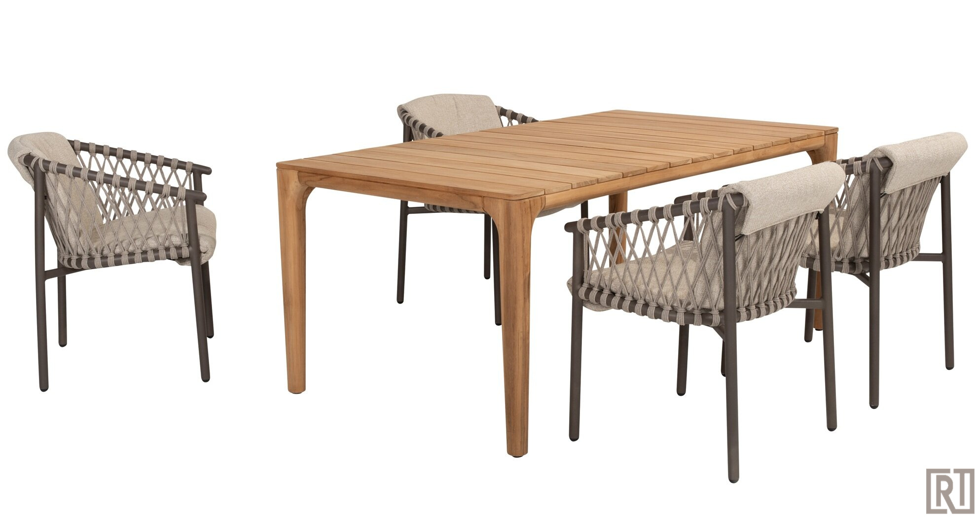 De Allora 5-delige dining set van 4 seasons outdoor is een vriendelijke dining set in de nieuwe kleur terre in combinatie met rope.