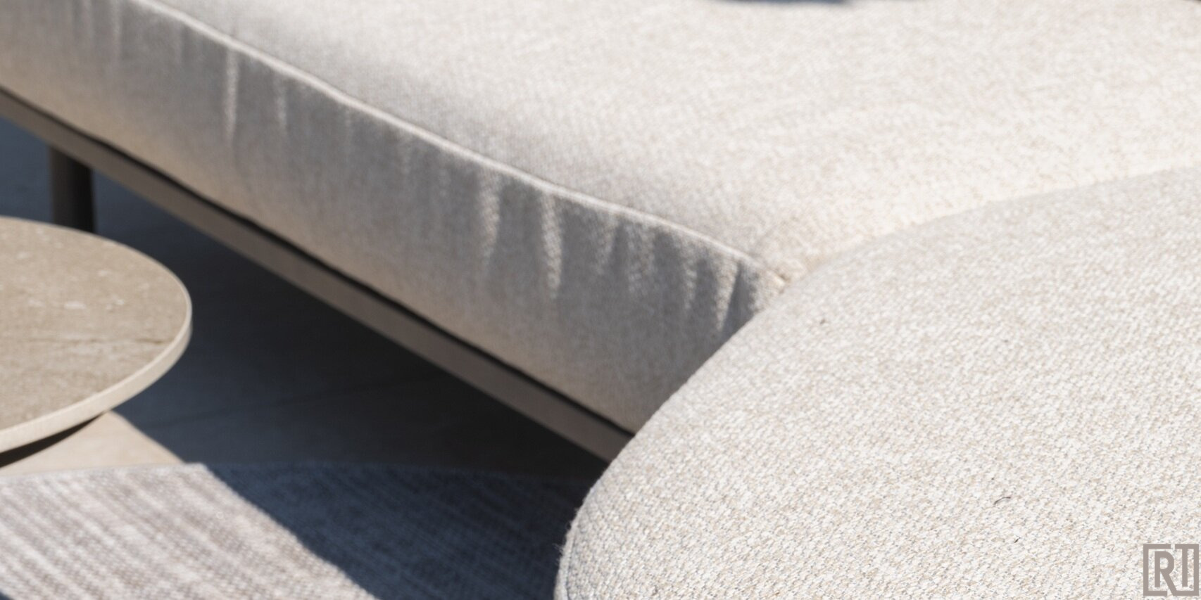 De loungebank wordt geleverd met een all weather kussenset in een fraaie taupe kleurige stof Ipanema zand