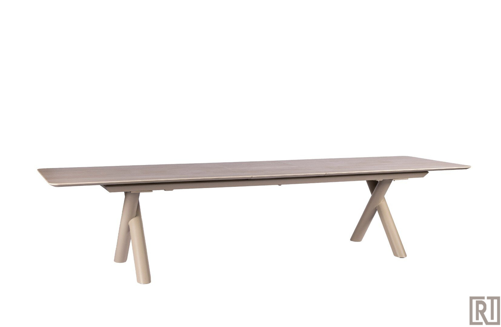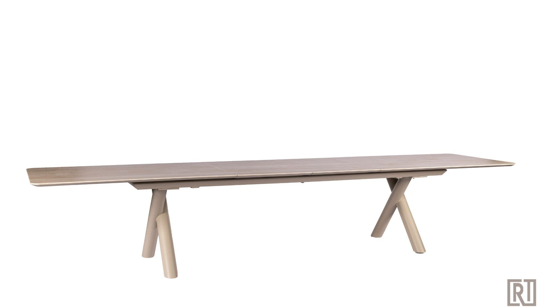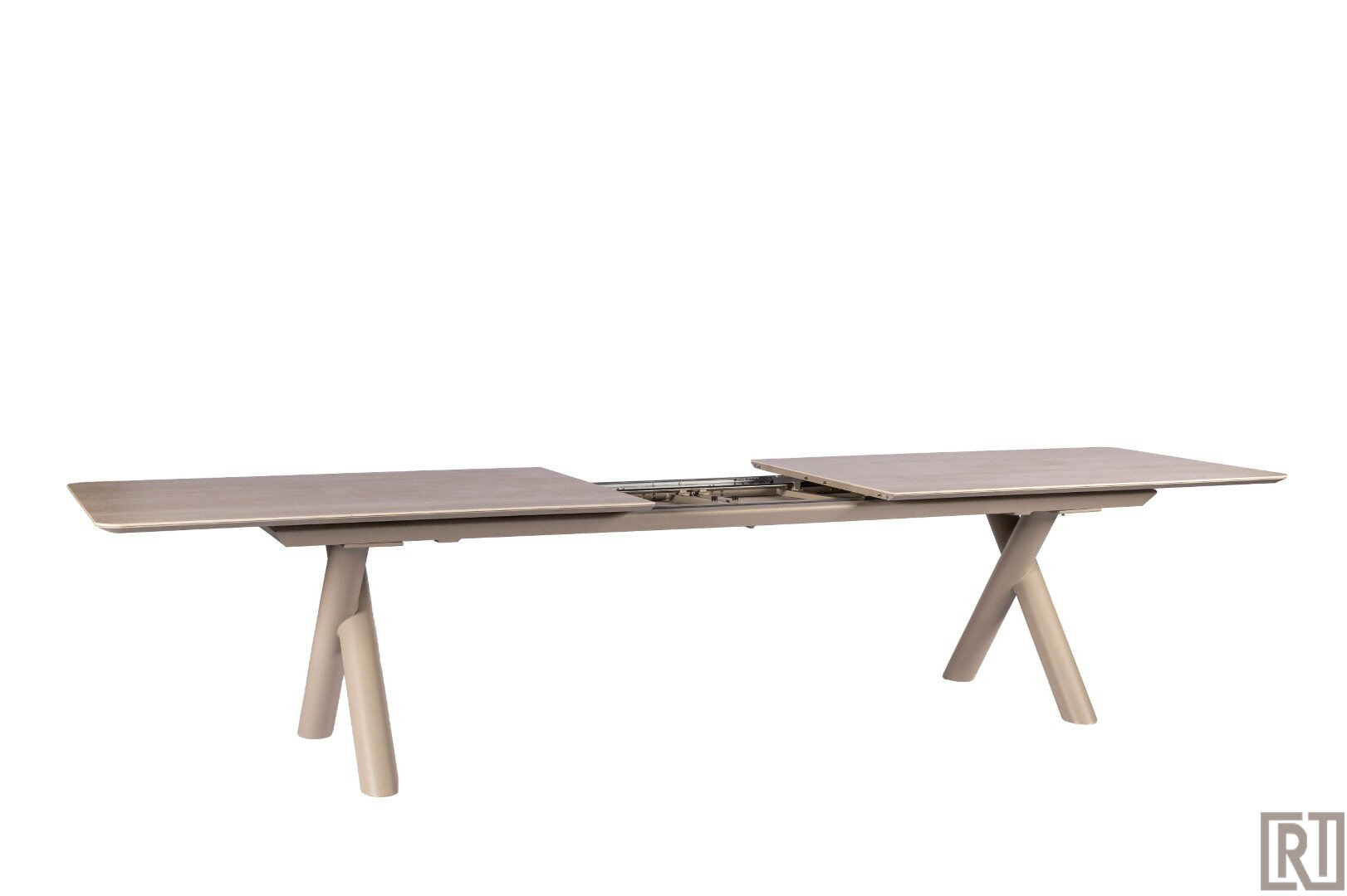 De Maratea uitschuiftafel wordt gemaakt van een aluminium frame met een keramiek blad in de uitvoering travertin.