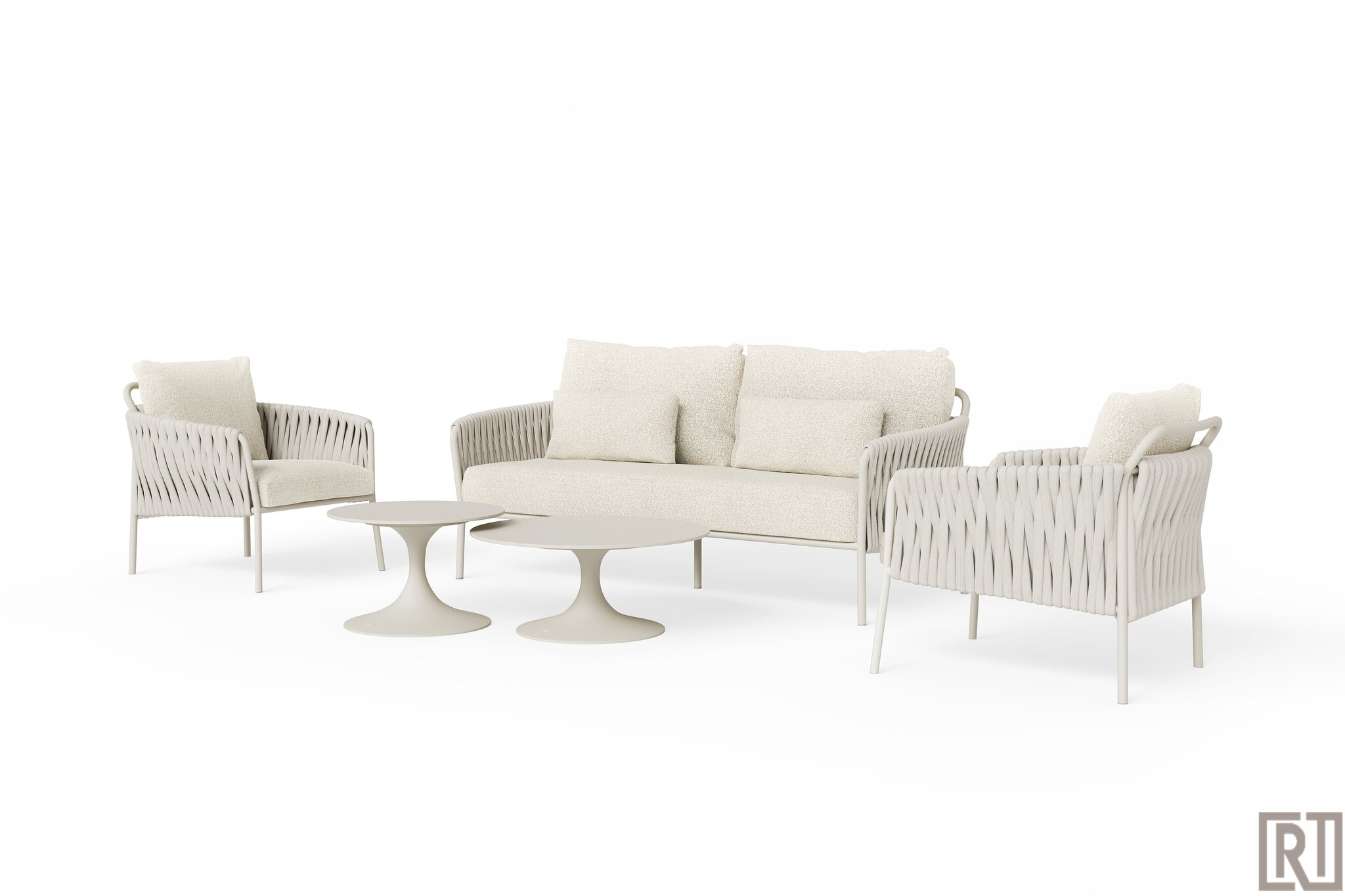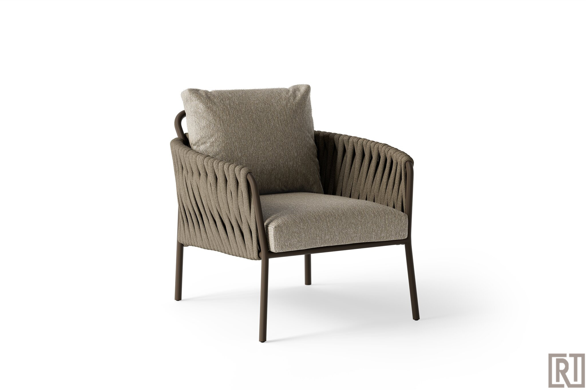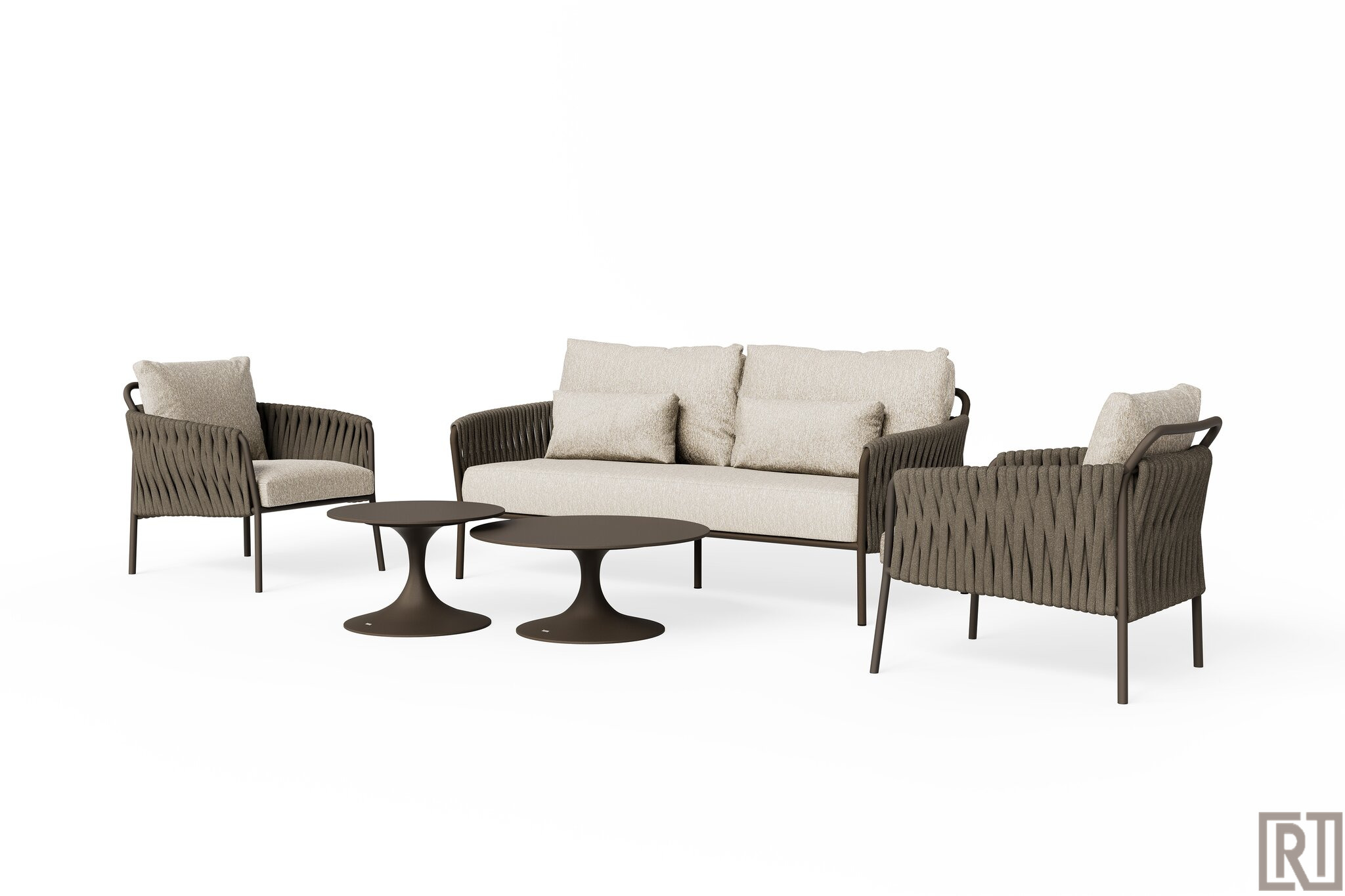De Fiave loungeset is in deze uitvoering uitgevoerd in bronze frame met Clouded rope en kussenset Pebble desert boucle